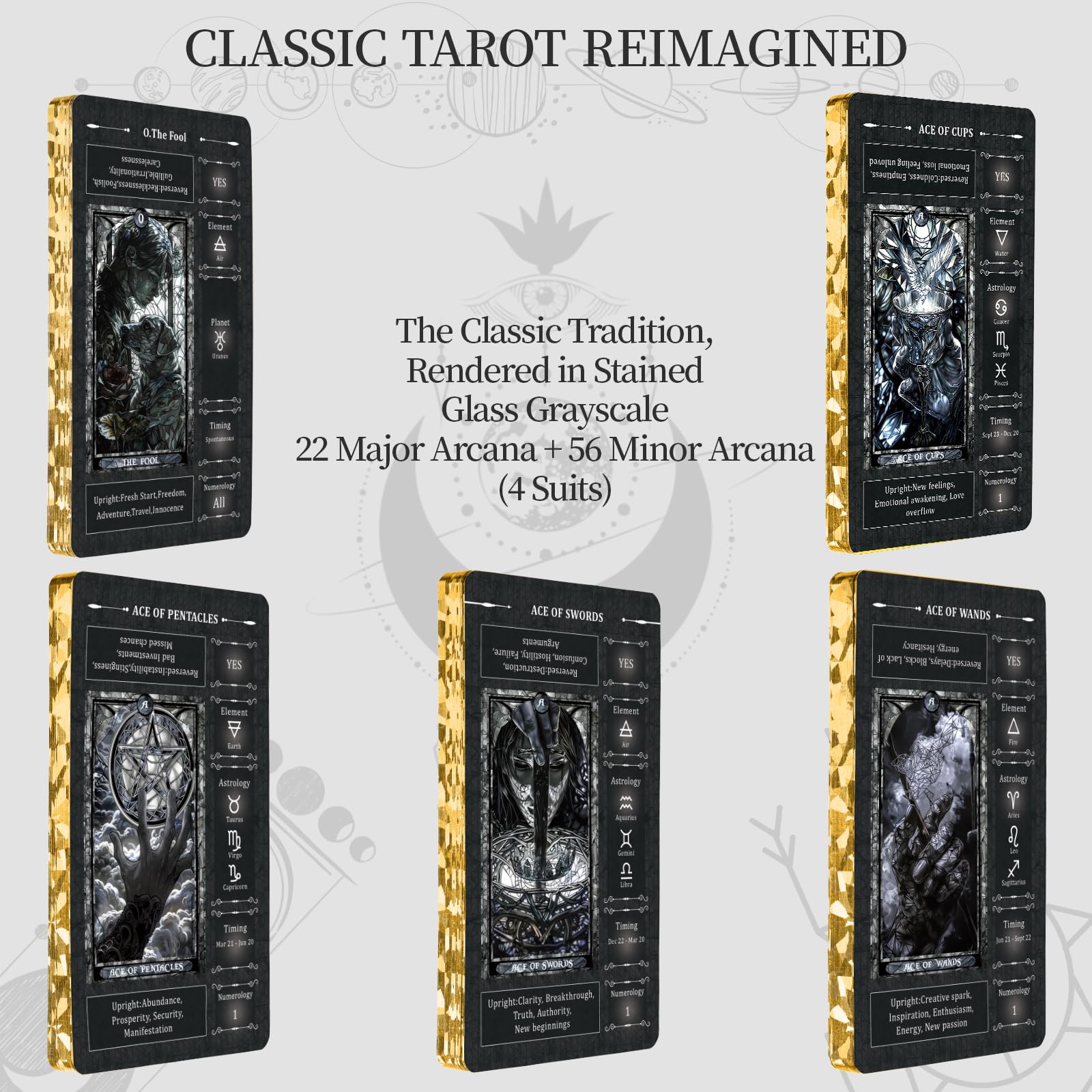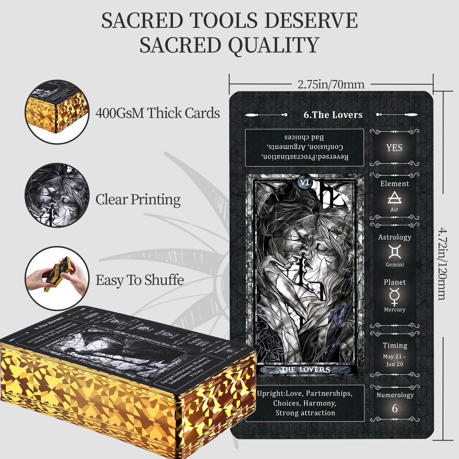 Unique Tarot Decks: Exquisite Stained Glass Artwork & HD Printing. Admire the intricate, high-contrast black and white stained glass designs, reproduced in stunning clarity with advanced 8-color printing technology. This distinctive Gothic-inspired style makes each card a masterpiece, ensuring this deck stands out as the crown jewel of any collection.