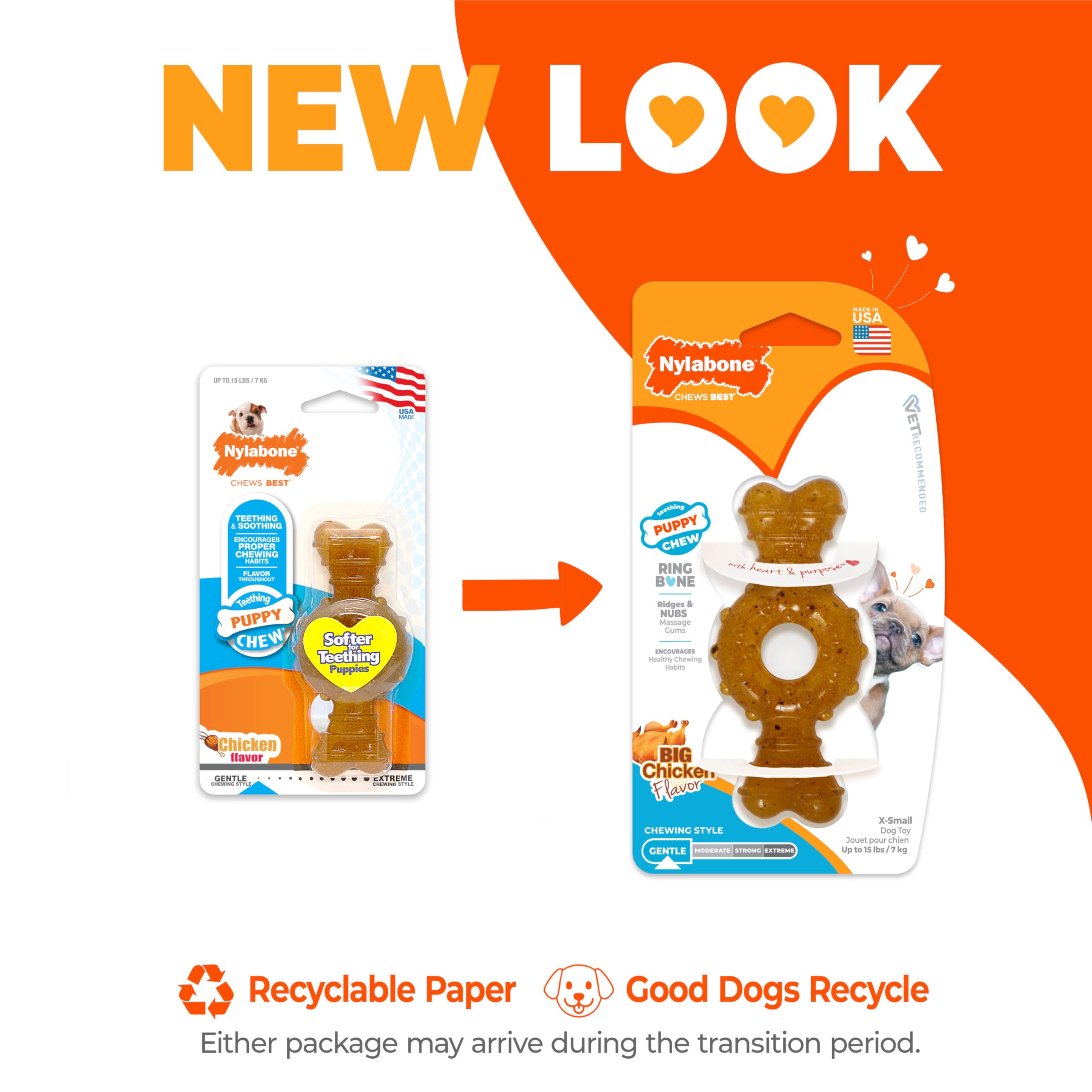 Help your puppy get started on the right paw by establishing healthy chewing habits right from the start! Our Puppy Ring Bone chew toy is made with soft, puppy-friendly material to satisfy the chewing needs of teething pups and encourage positive chewing habits from a young age. With savory chicken flavor throughout, pups will stay occupied and happy. Plus, this puppy teething toy features ridges and nubs that help reduce plaque and tartar buildup as pup chew. This puppy teething ring is not for puppies with adult teeth or for powerful chewers. This chew is the perfect toy to comfort your teething puppy! What your dog chews matters! With destructive behavior among the leading reasons dogs are returned to shelters, we know healthy habits can make a life-changing difference. For 70 years, our family-founded brand continues to safely satisfy dogs’ chewing instincts and help them stay in loving forever homes!