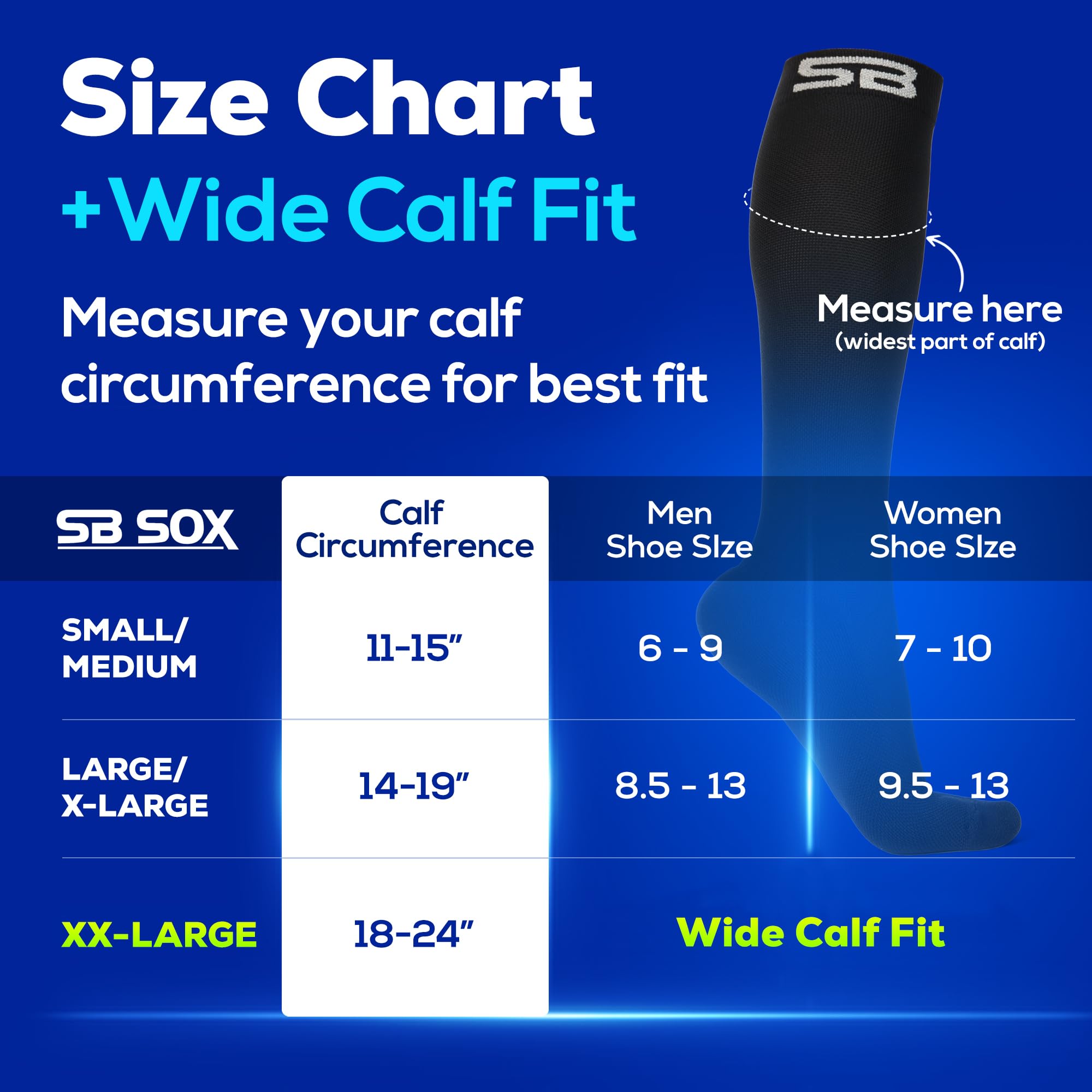 Measure your calf circumference and check your shoe size. Upsize if your shoe size is above the given range for your calf size. SMALL/MEDIUM: 11–15” calf | Men’s 6–9 | Women’s 7–10; LARGE/X-LARGE: 14–19” calf | Men’s 8.5–13 | Women’s 9.5–13; XX-LARGE: 18–24” calf | Men’s 12–14+ | Women’s 12–14+
