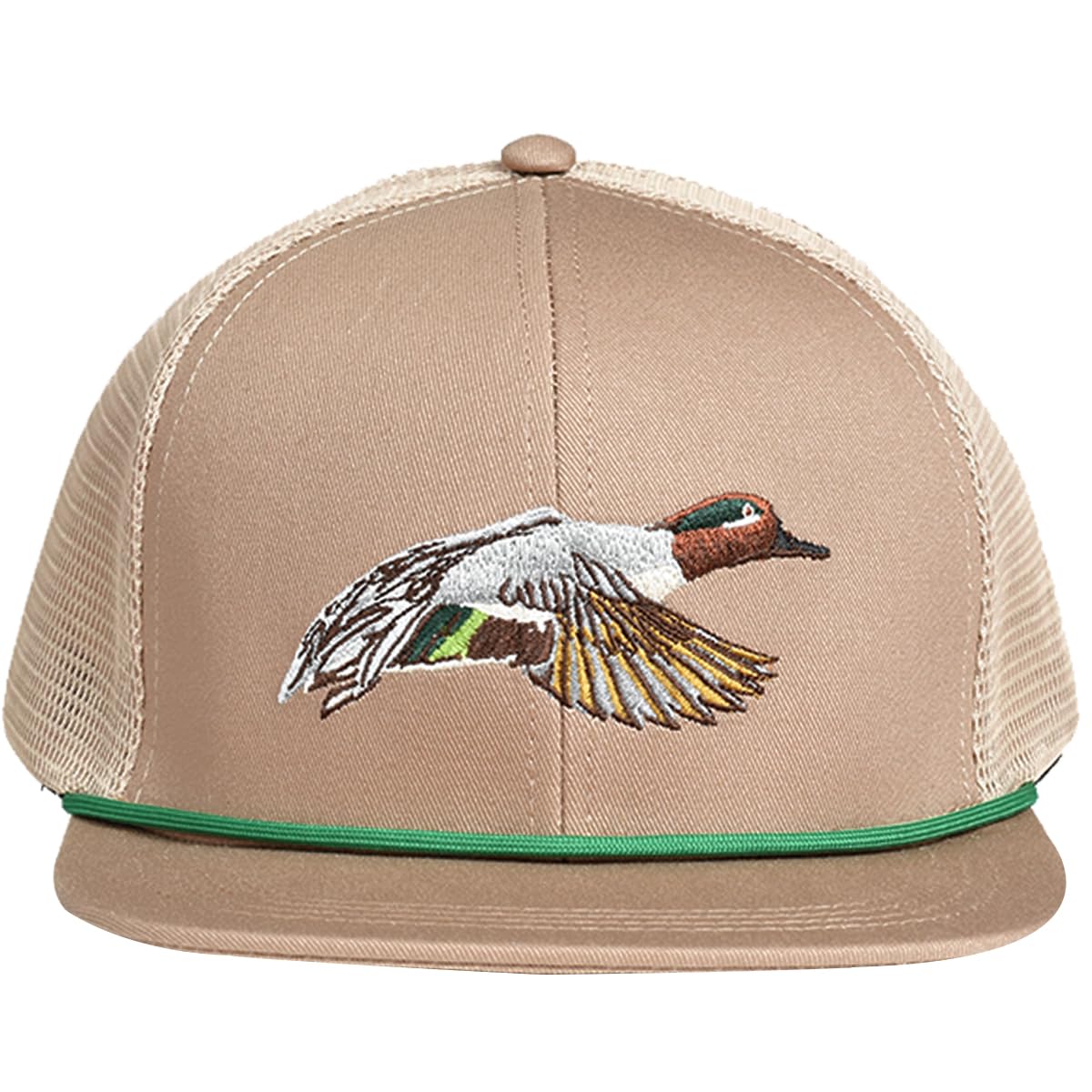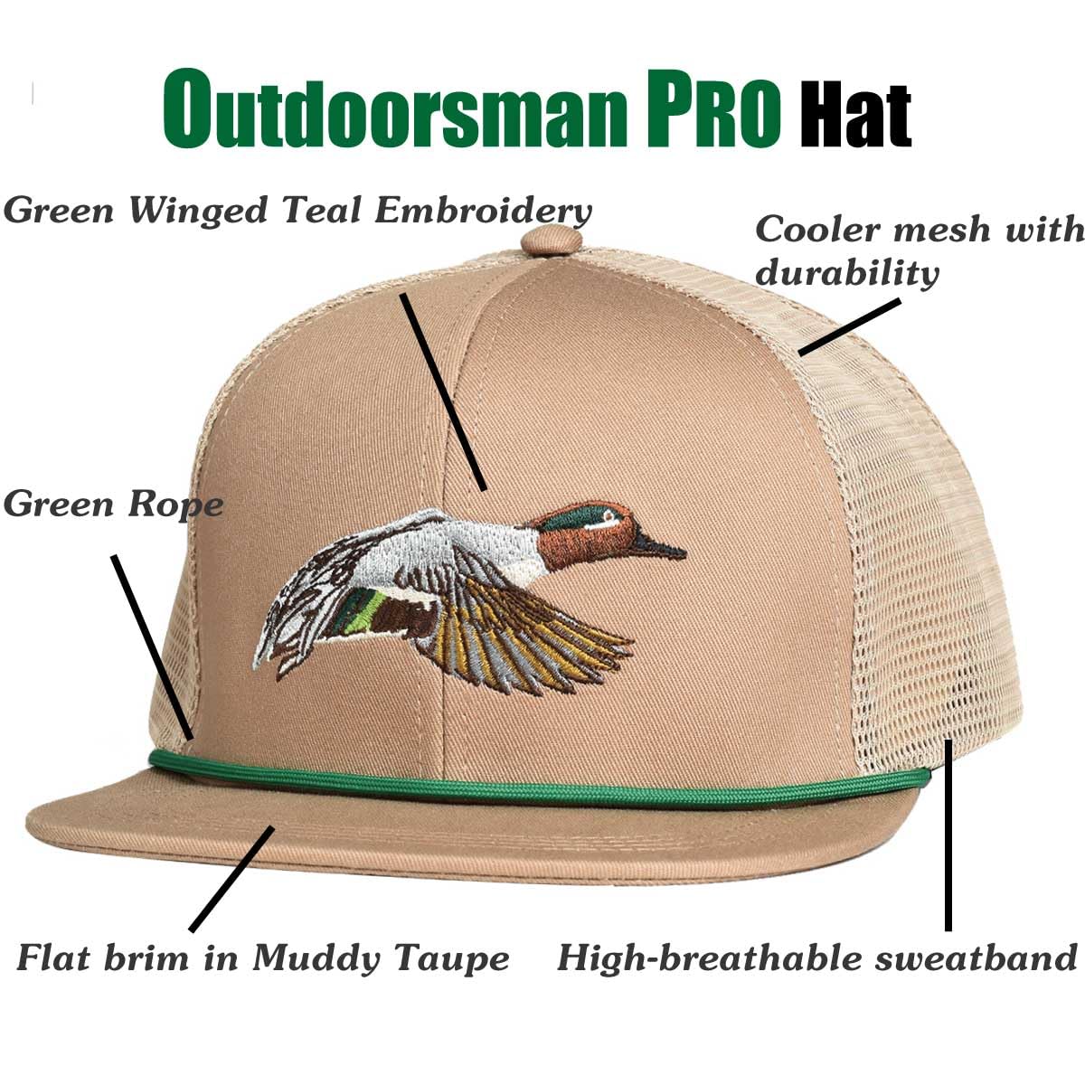GREEN WINGED TEAL DUCK HAT - Each hat features unique and high quality embroidery. Unique green winged teal duck embroidery with unmatched details on front panel. Muddy Taupe front panel with green rope makes Outdoorsman Pro hat more vintage & obsessed. The great gift for duck hunters, outdoorsman and wildlife enthusiast