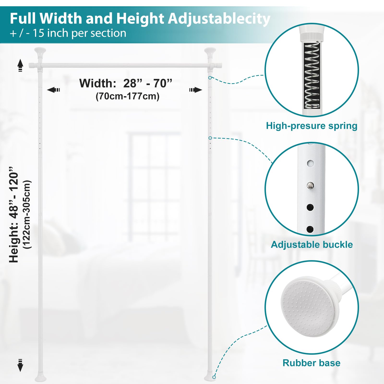 Height and Width Adjustable with Aesthetics: Our room divider curtain rods allows you to adjust its width from 28” to 70”, height from 48” to 120” to perfectly match your needs by adding or taking out extension rods. Solutions to uneven walls, or somewhere that a normal curtain rack can't go
