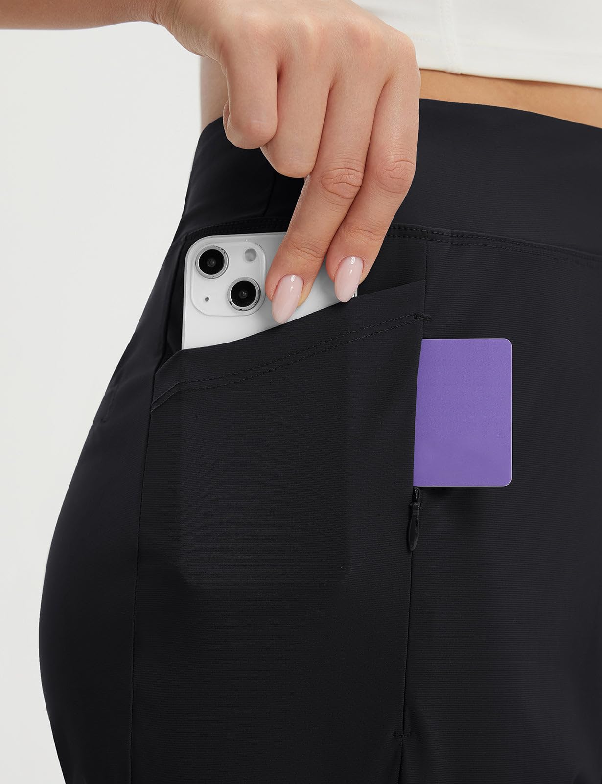 5 Pockets: 2 side pockets + 1 right zipper pocket-(the deep two side pockets can easily hold your phones, keys, and daily essentials effortlessly, while the right-side hidden zipper pocket allows you to stores important items securely); and the two faux back pockets enhance the contour of the hips, adding a touch of sophistication and casual flair