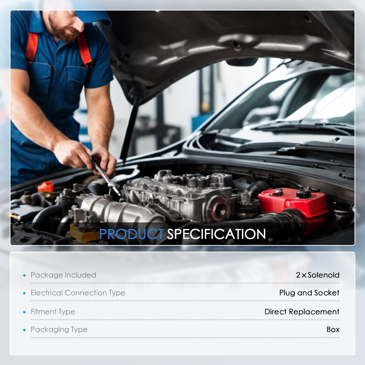 [VVT solenoid intake & exhaust Product Description:] Engine Variable Valve Timing (VVT) Solenoid, Pack of 2, included with: Exhaust & Intake VVT Valve. A faulty variable valve timing control solenoid, or spool valve, can result in a check engine light accompanied by engine hesitation and pinging under acceleration.