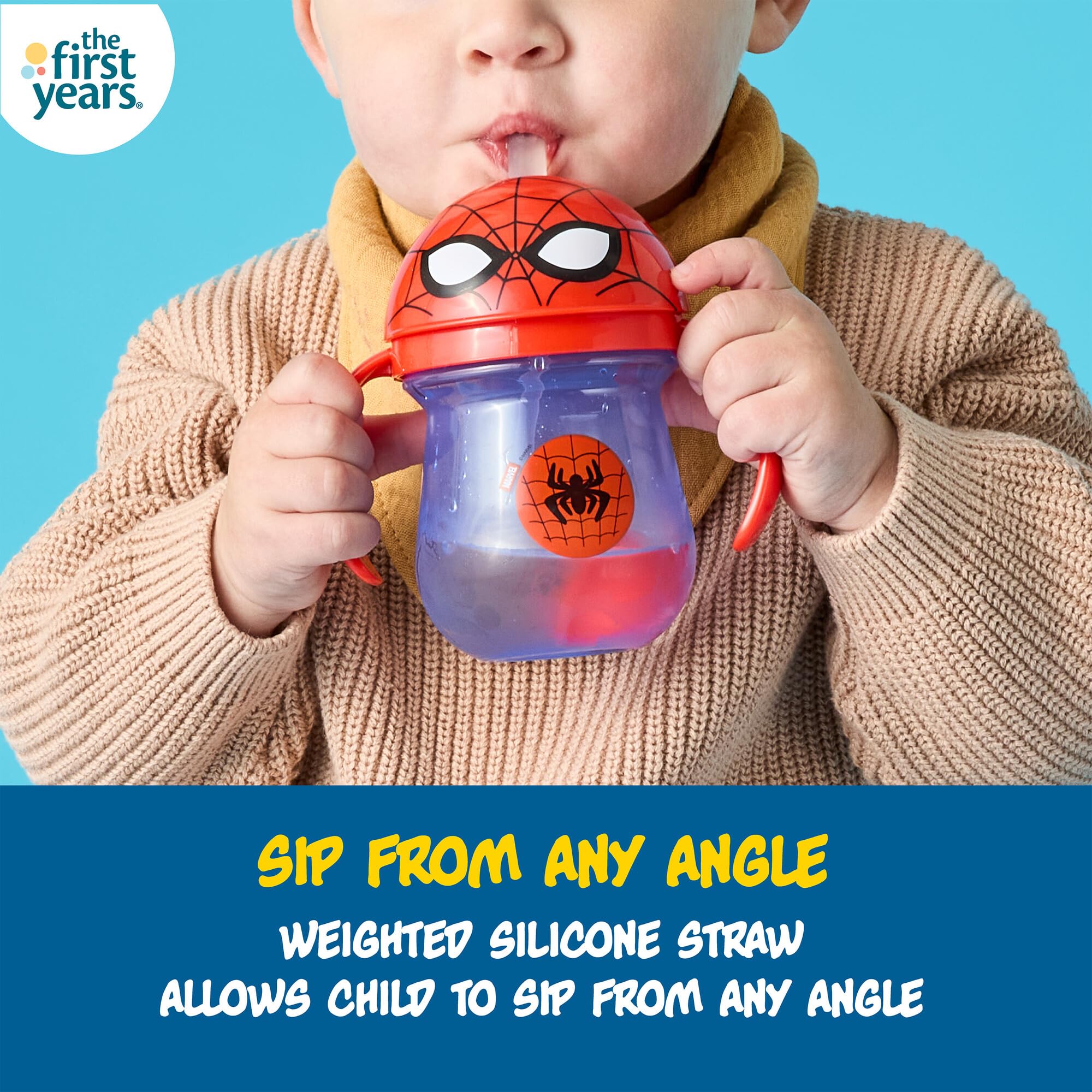 Sip from any Angle: This Spider-Man-themed cup features a weighted silicone straw that allows your child to sip at any angle from their toddler cup, with no drop left behind!