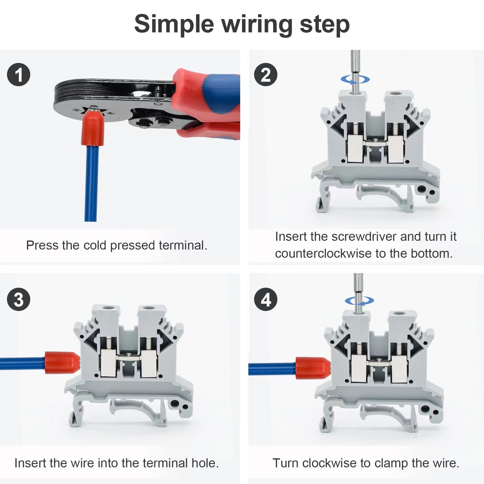 【Wiring Mode】: Strip the insulation layer of the wire with wire stripper, insert the cold pressed terminal, press the cold pressed terminal with wire crimper insert a slotted screwdriver and rotate it anticlockwise to rotate the wire crimping frame to the bottom, insert the wire into the depth of the terminal hole, rotate it clockwise to clamp the wire, and then take out the screwdriver.