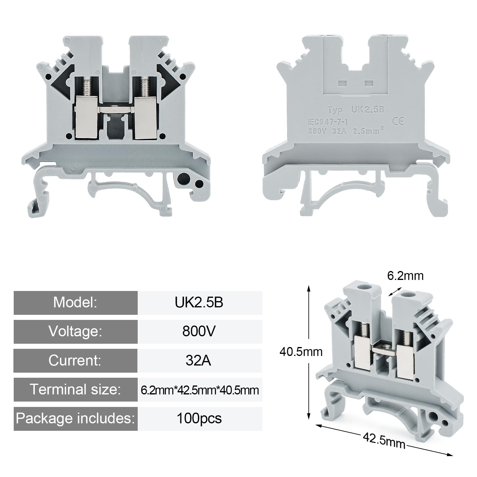 Description: The product is made of high-quality insulating materials and pure copper, which is flexible and convenient to use, and can ensure the personal safety of operators. Also it has a wide range of applications that can greatly meet your needs. Features: High quality materials can resist bad weather. The conductive sheet is made of pure copper with strong electrical conductivity. The reasonable design structure makes the operation convenient and also ensures the personal safety of the staff. Wide application range can greatly meet your needs. Specification: Material:High quality insulating materials and pure copper conductive sheet. Colour:Gray Model:UK-2.5B Current:32A Voltage:800V Terminal size:6.2*42.5*40.5 mm Package:100 pack