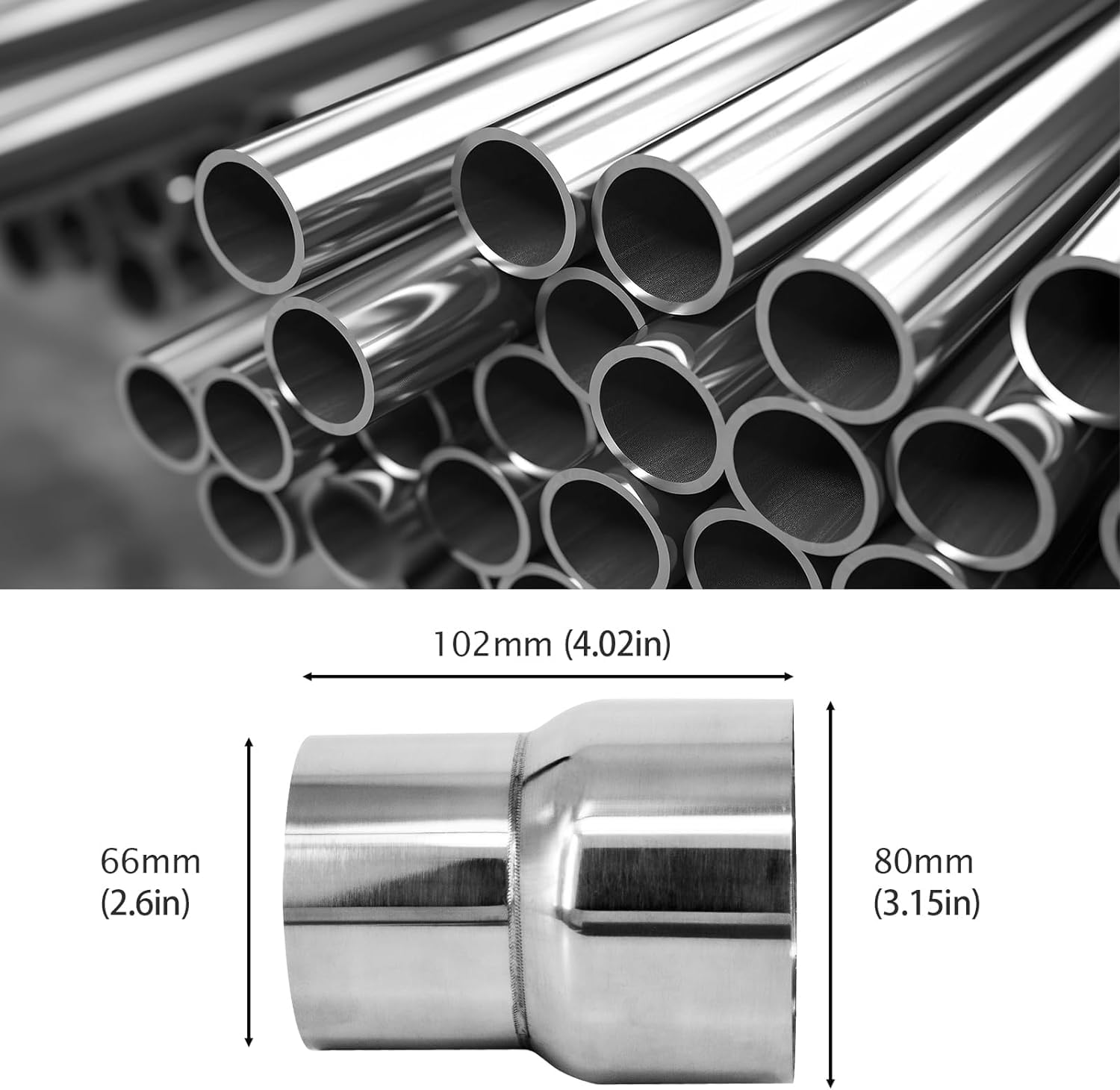 【 Material】: The 2" ID 3" ID exhaust pipe adapter Connector Reducer is constructed with 304 Stainless steel. It is totally rust and corrosion resistant.