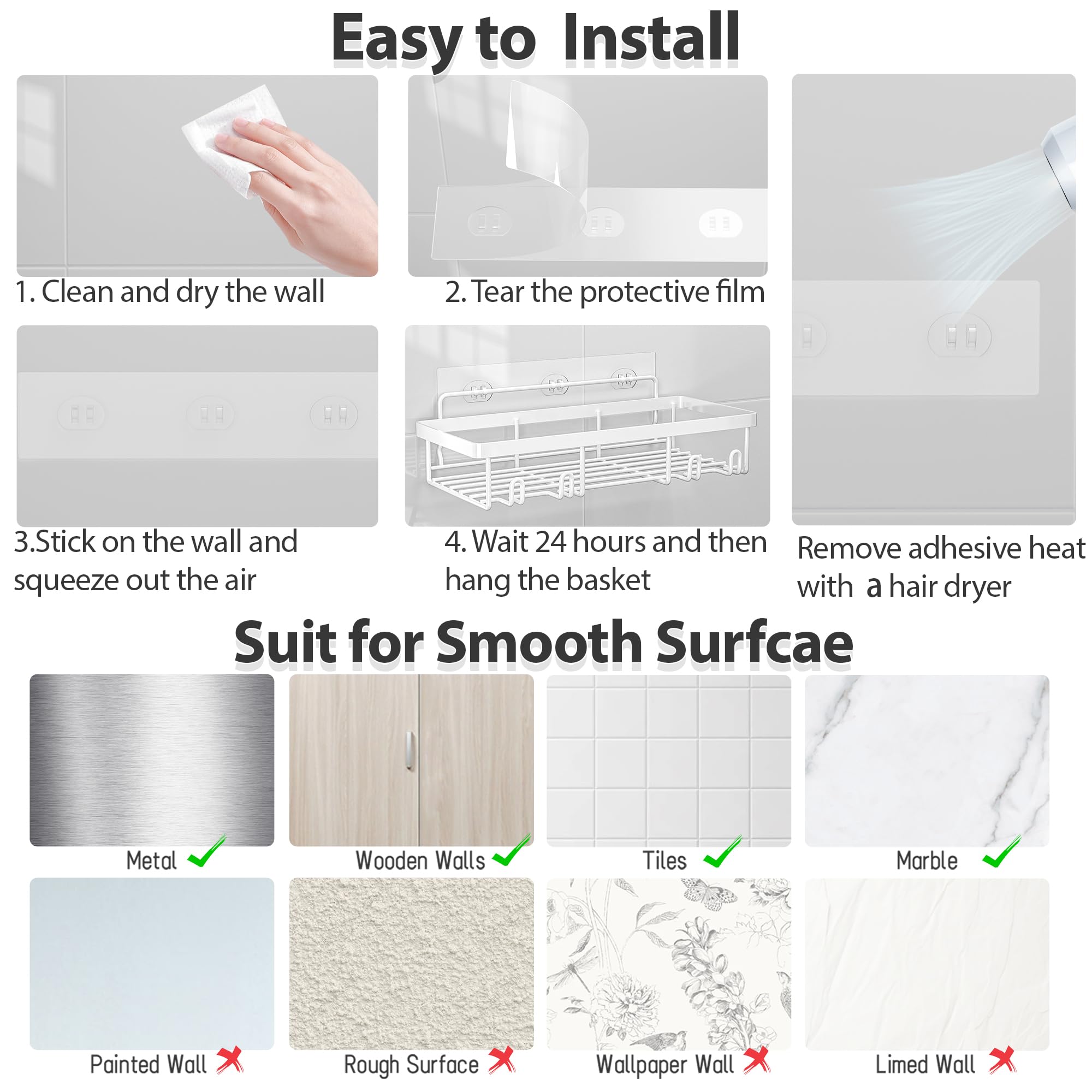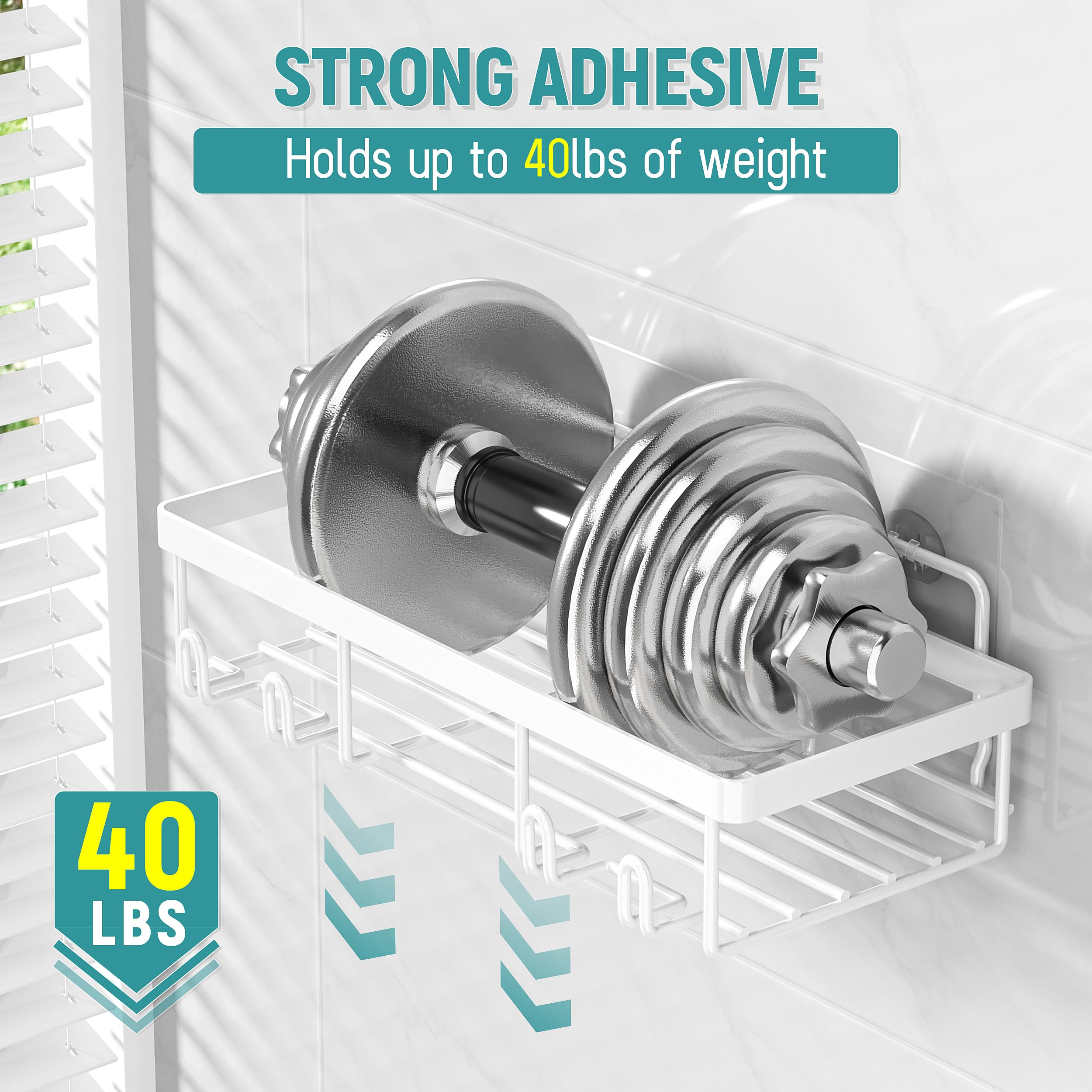 Strong Adhesive: 1 piece adhesives can stand up with 40 lbs, Keep the tins and bottles in the bathroom shower caddy, and make them easy to fetch and use. Never worry it falling off the wall after stick on the shower racks