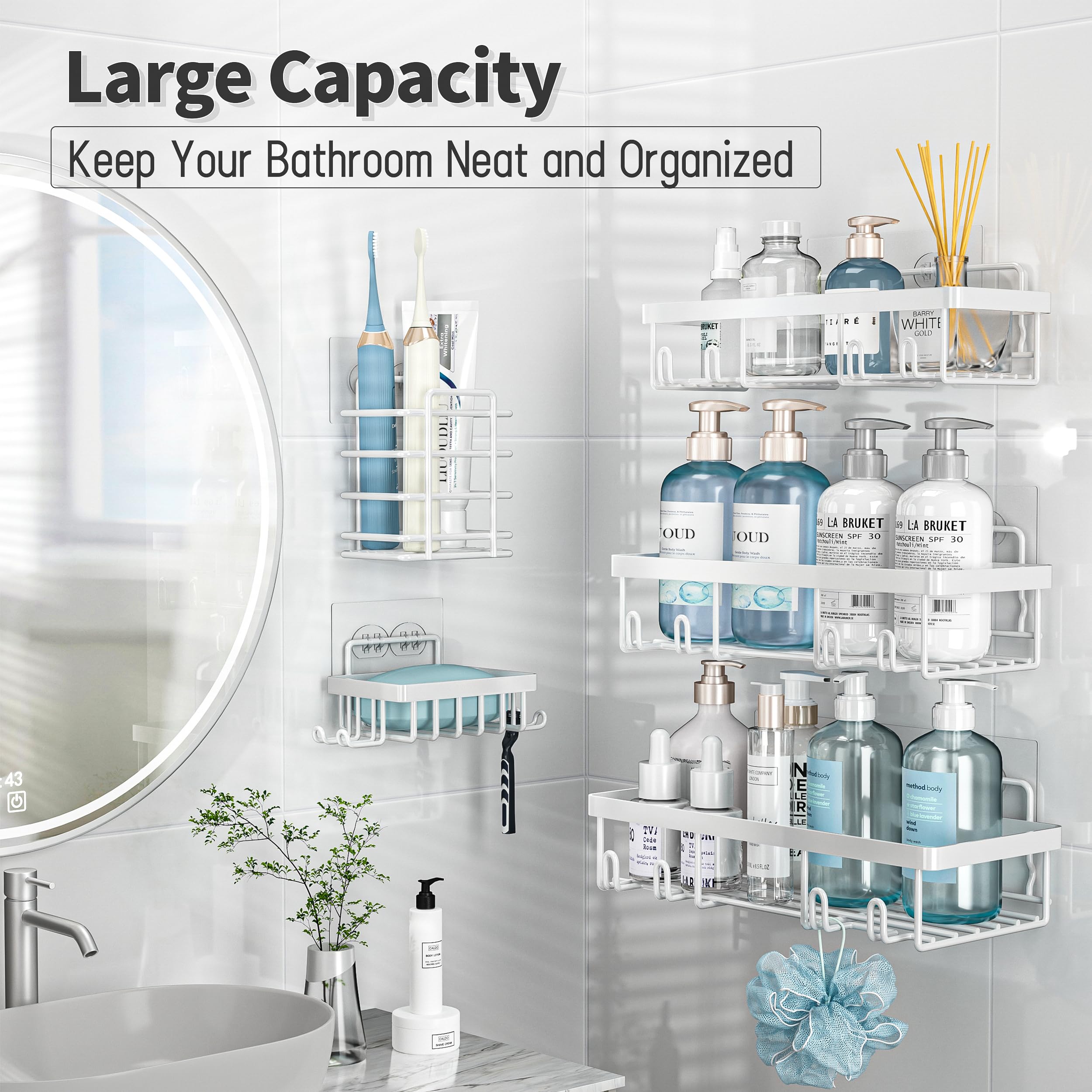 5 PCs Large Storage Shower Caddy: The bathroom shower organizer set comes with 3 wall shower caddies, 1 soap holders, 1 toothbrush holder and 5 adhesives. Liuoud Shower Shelves can store all of your bath supplies