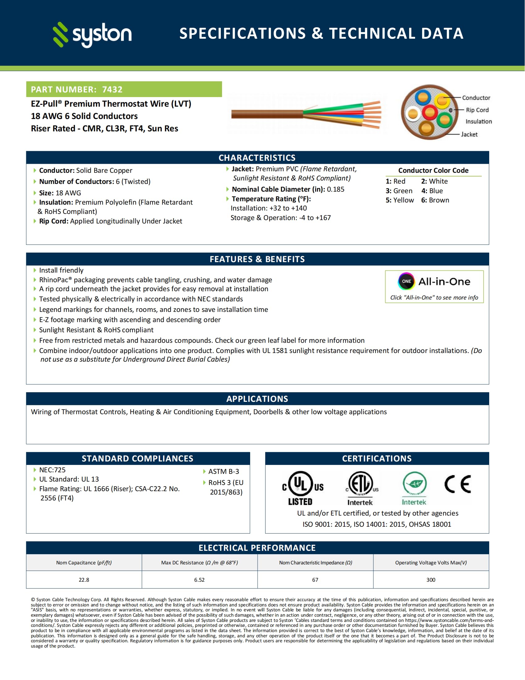 300V Low-Voltage Thermostat Cable (CL3 Rated): 300V rating ensures superior insulation and a high safety margin for low-voltage use, making it ideal for thermostats, security systems, and audio/visual installations while complying with Class 3 (100VA) power-limited standards.