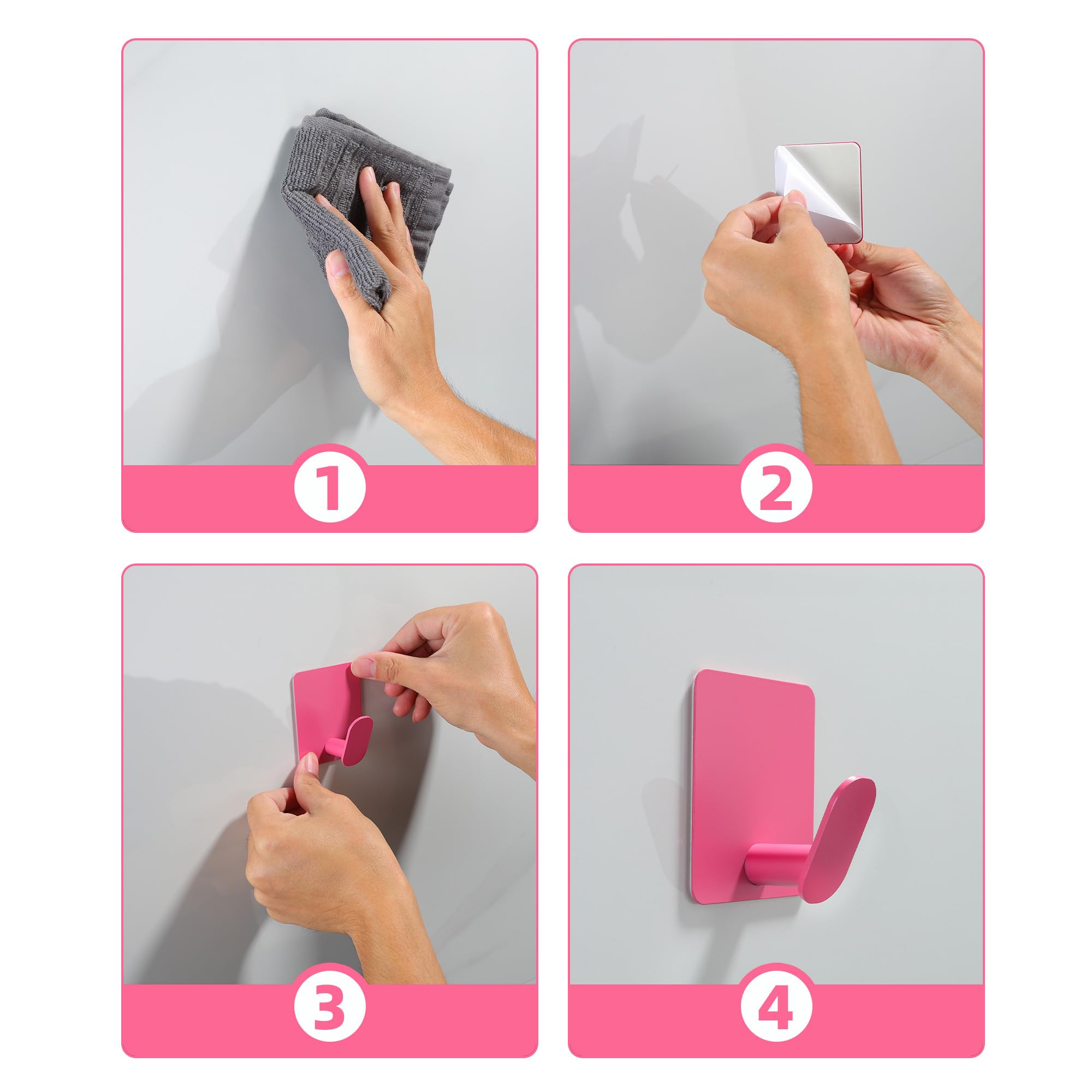【No Drilling Required】Just tear off the protective film on the back of the hook and press it to stick on the wall. Please keep the wall clean, dry and flat before sticking this pink hook. It is best to wait 24 hours before hanging items to ensure better adhesion of the wall hook