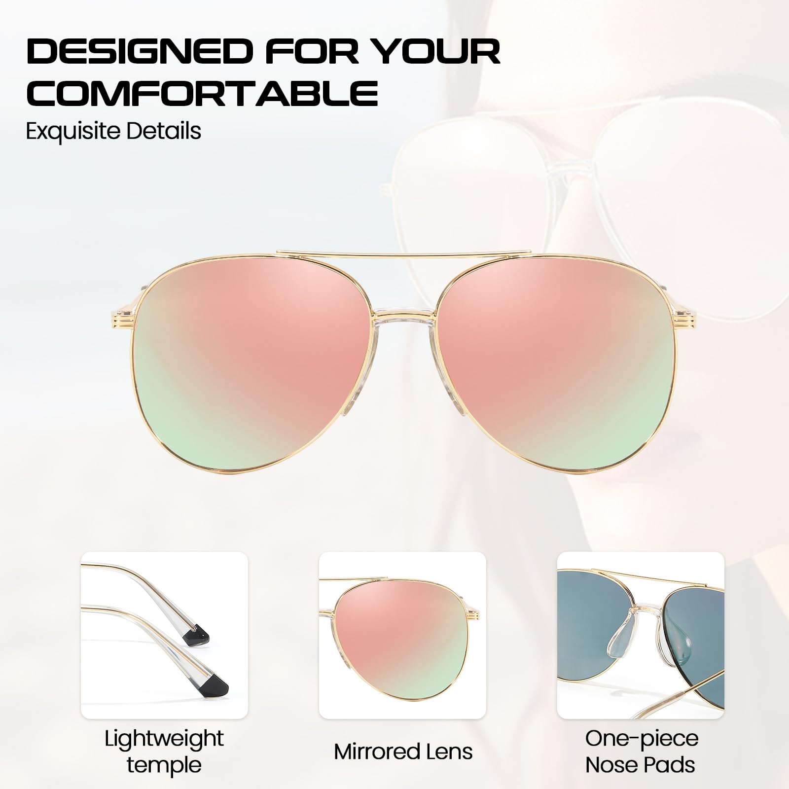 Double Metal Bridge: The stylish double metal bridge adds a touch of sophistication to the classic aviator design. This feature not only enhances the aesthetic appeal but also provides added structural support, ensuring a comfortable and secure fit for both men and women.