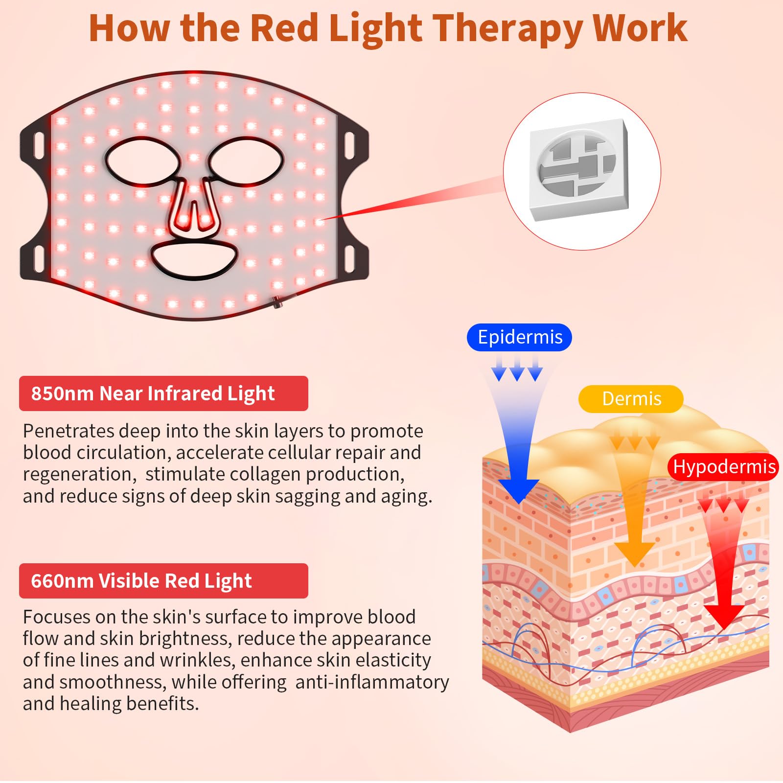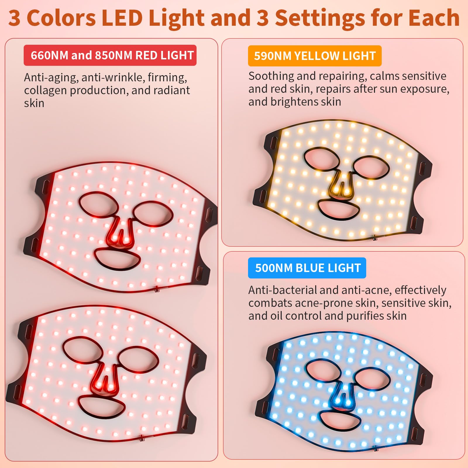 Multiple Light Spectrum Options: Our red light mask features 850nm & 660nm red light, 590nm yellow light, and 500nm blue light, offering a versatile experience. Each light wavelength serves different needs, promoting a refreshed and glowing look.