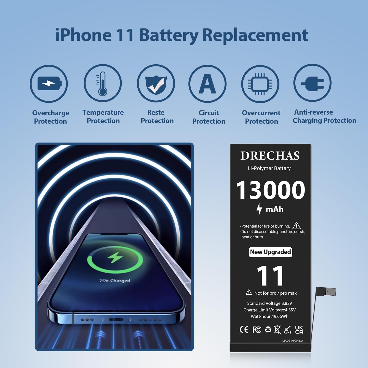 [13000mAh]Battery for iPhone 11, 2025 New Upgraded High Capacity 0 Cycle Li-Polymer Replacement Battery for iPhone 11 Models A2111, A2221, A2223 with Complete Professional Repair Tool Kit IMPORTANT NOTE: 1. Please confirm your phone model at the back of your Phone before placing an order. 2. To reach optimal performance, please use the original charger or use big current charger to charge the battery. 3. To extend battery life, drain the battery, then recharge to 100% for one hour, and repeat this 3-5 times for optimal battery use. 4. If your Phone has the battery indicate issue after install our battery, please try again firmly press the battery connector, make sure it connect perfectly, then reboot your Phone, the battery indicator will work correctly. 5. The most important and difficult part is removing the battery by removing the sticky flexible tape without damaging the old battery, make sure to heat-up the phone at the back with a hairdryer to make it flexible. 6. If you don't know how to replace the battery, it is highly recommended that you follow the steps to install it after watching the related video on Youtube. As the installation video is for reference only, the tools in the video may be different from our package. Product List: 1x 13000mAh Battery for iPhone 11 1x Complete tool kit 1x Battery Adhesive Strips 1x Blue Sealant