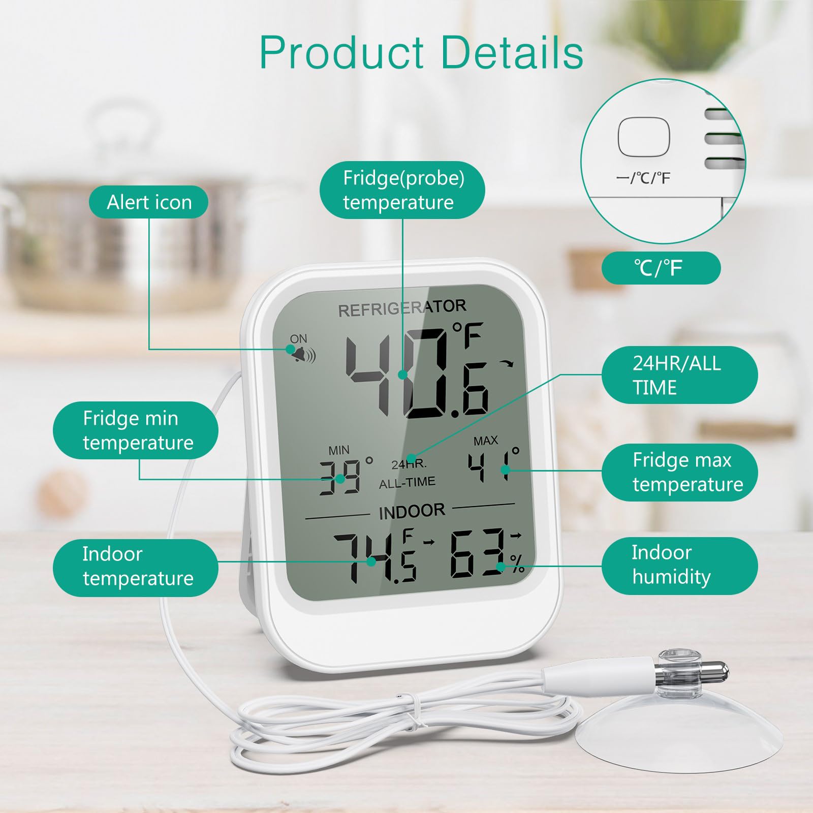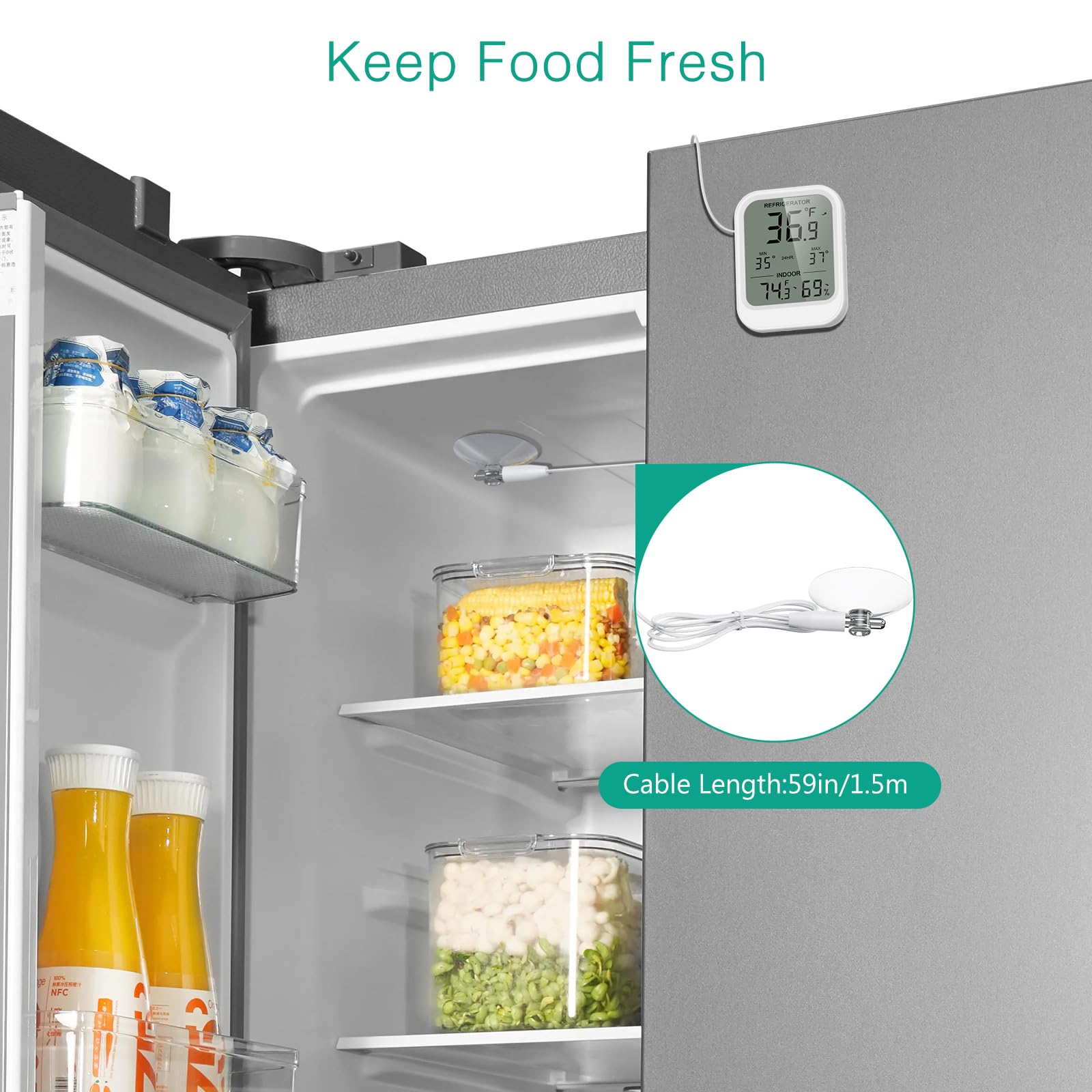 Dual-Temperature Display & Max/Min Records: This digital refrigerator thermometer supports the display of indoor temp/humidity and probe readings on its 3-inch LCD screen, and records 24-hour or all time Max/Min temperatures. Great for optimizing storage conditions