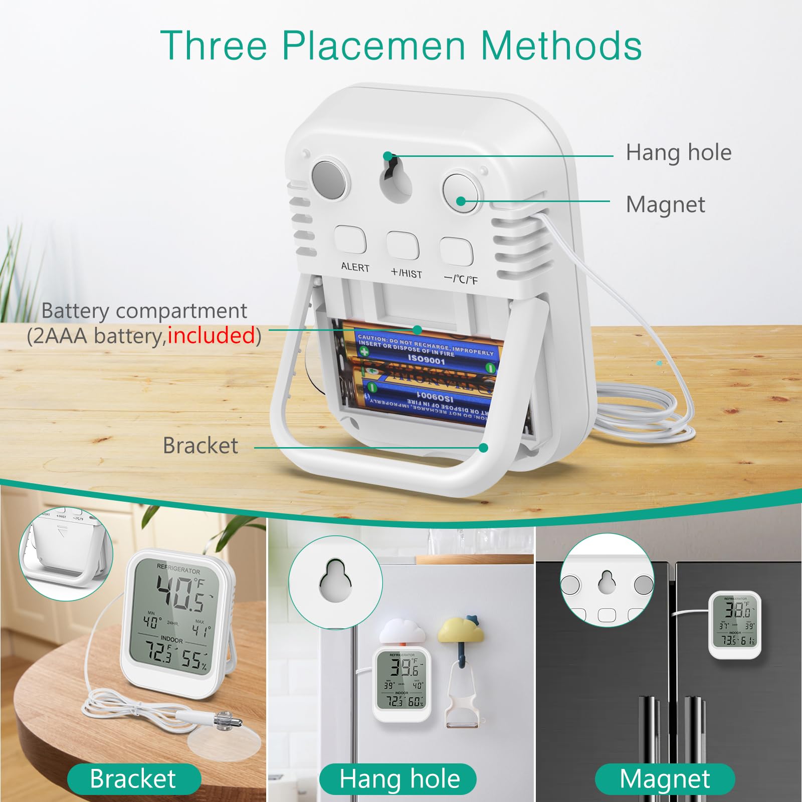 3 Installation Methods: The freezer temperature monitor has a foldable bracket on the back —simply unfold it for tabletop placement, or fold it flat to hang (using the built-in hole) or attach magnetically to metal surfaces like refrigerators