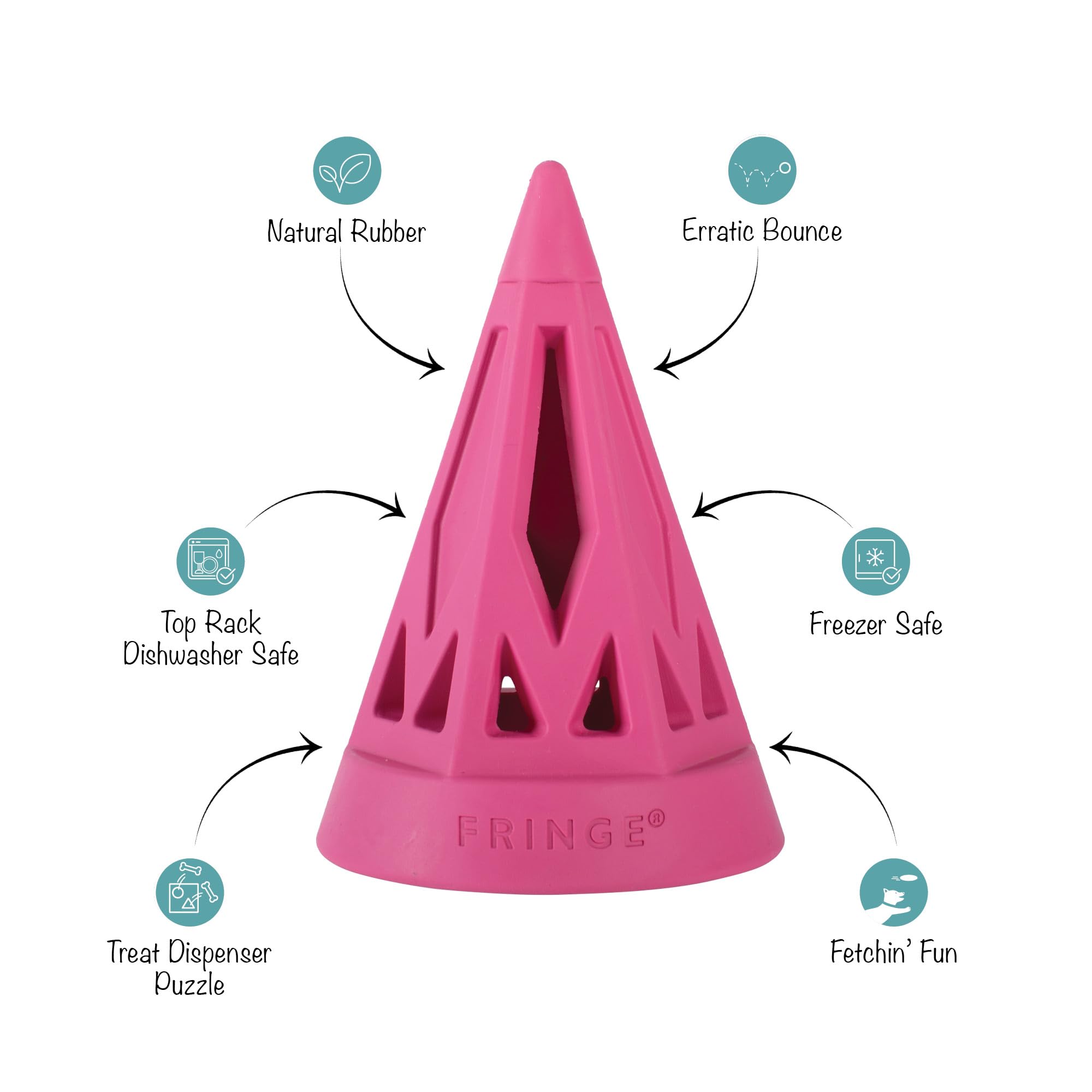 Ready to join the Dura Club? PetShop by Fringe Studio's "You Cone Do It!" hot pink rubber dog toy is for pups that love to work for their treats, chew, and play lots of fetch. As a treat dispenser puzzle with an erratic bounce and made with natural rubber, this toy was created for long-lasting interactive play. Simply fill it with treats or thread it with a bully stick, then toss it for some fetchin' fun to keep your pup busy trying to get them out. Great for all-sized dogs and strong chewers.