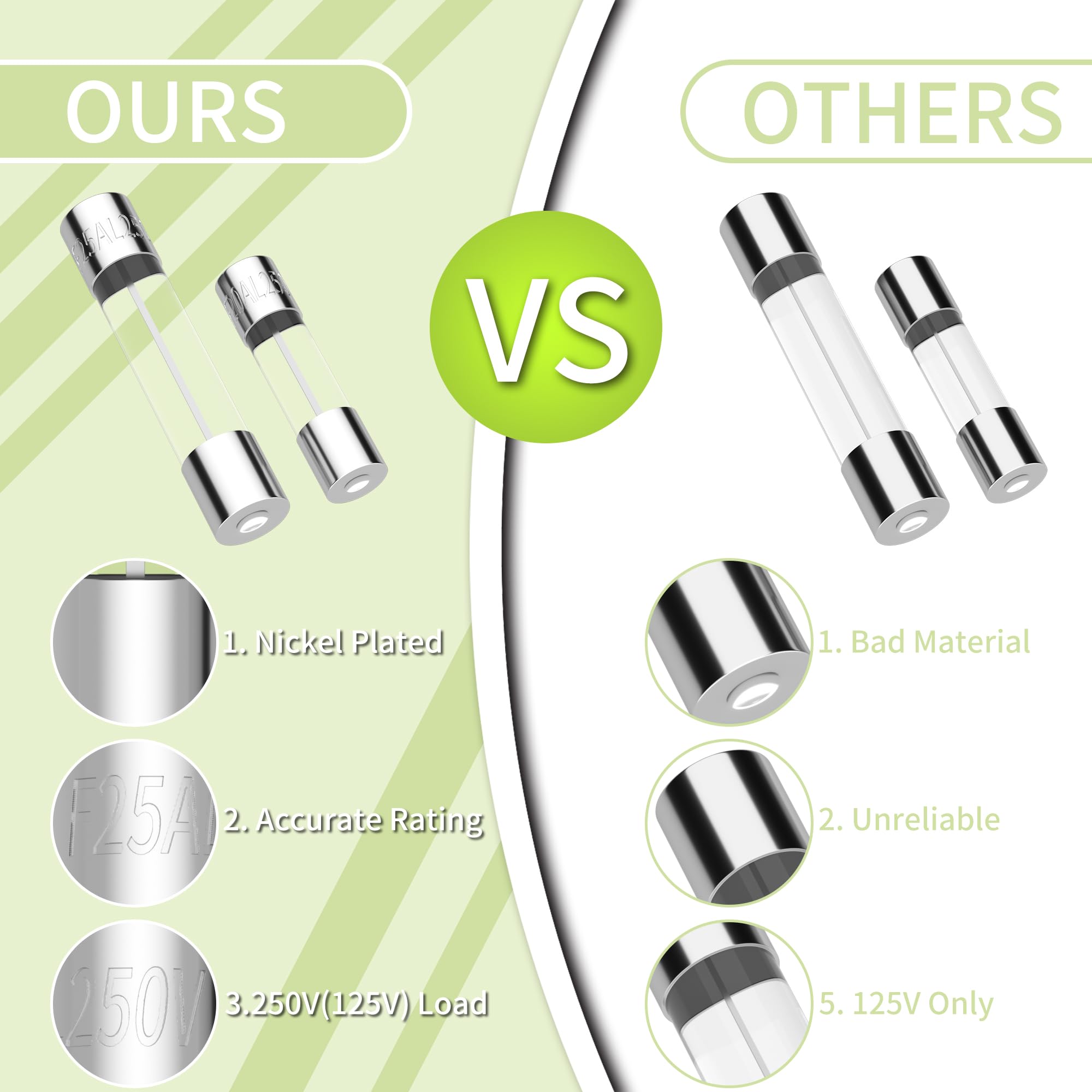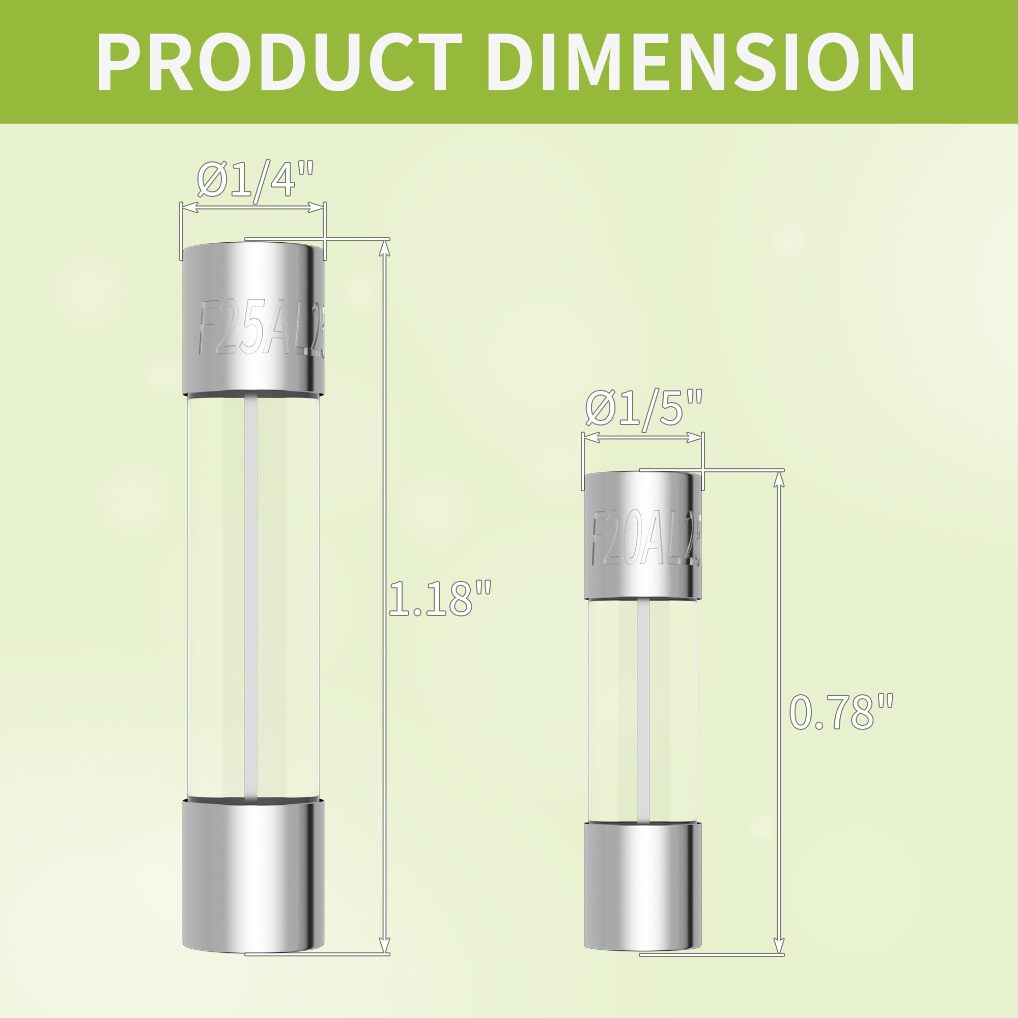 Product Dimension: 5x20mm: 0.2x0.78Inch & 6x30mm: 0.25x1.18Inch, the Auto Glass Tube Fuse is made of high quality glass and metal.