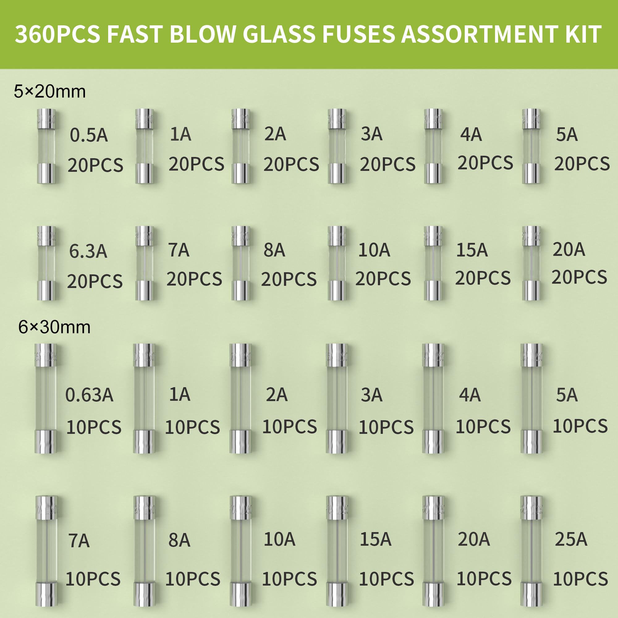 Package Includes: This Fast Blow Glass Fuses Assortment Kit includes 6x30mm/12 kinds: 0.63A 1A 2A 3A 4A 5A 7A 8A 10A 15A 20A 25A; 5x20mm/12 kinds: 0.5A 1A 2A 3A 4A 5A 6.3A 7A 8A 10A 15A 20A, total 360pcs.