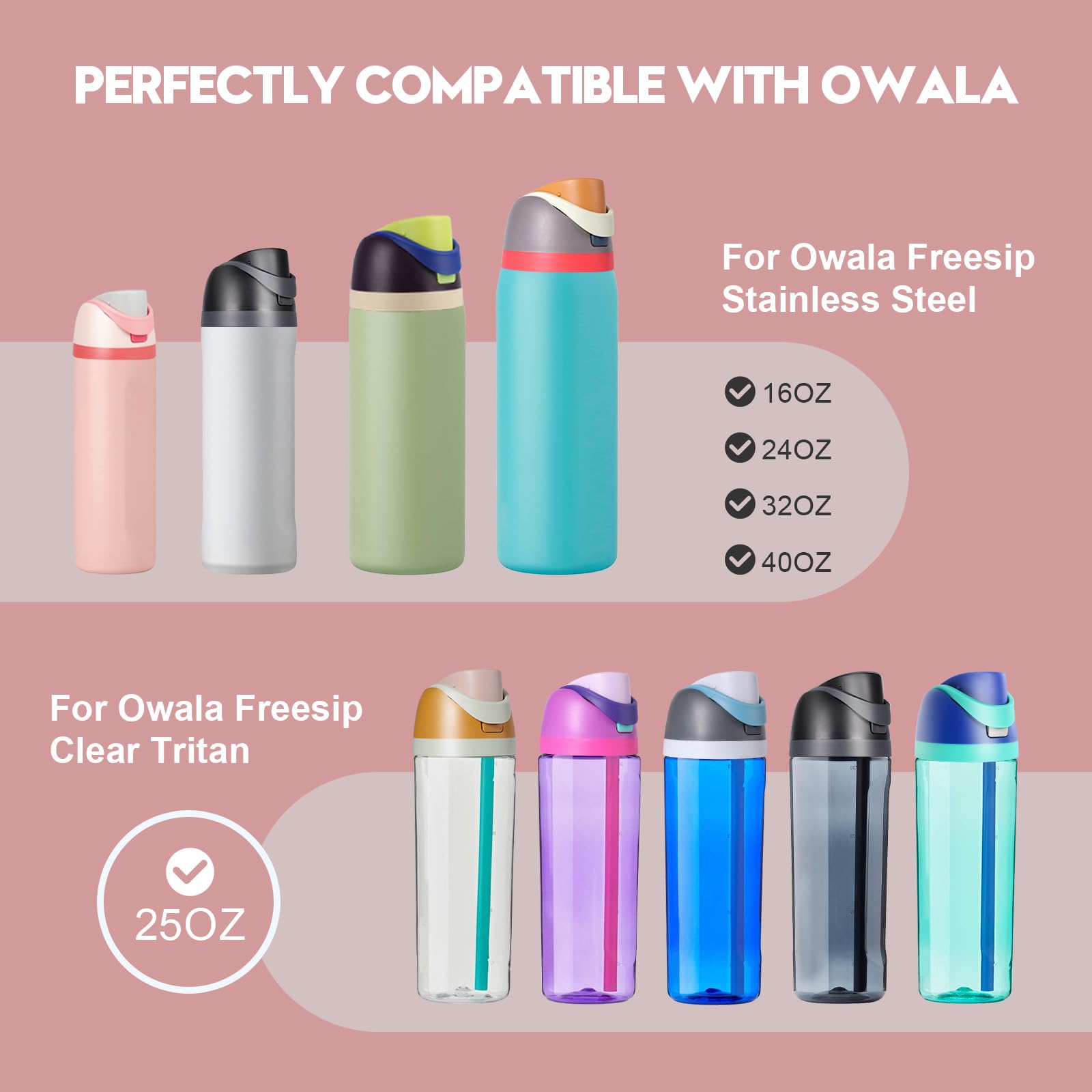 【Precise Compatibility】Specifically designed to fit Owala FreeSip Stainless Steel bottles (16oz/24oz/32oz/40oz) and 25oz Clear Tritan Plastic bottles. Always confirm your bottle model prior to purchase to ensure perfect fitment and performance.