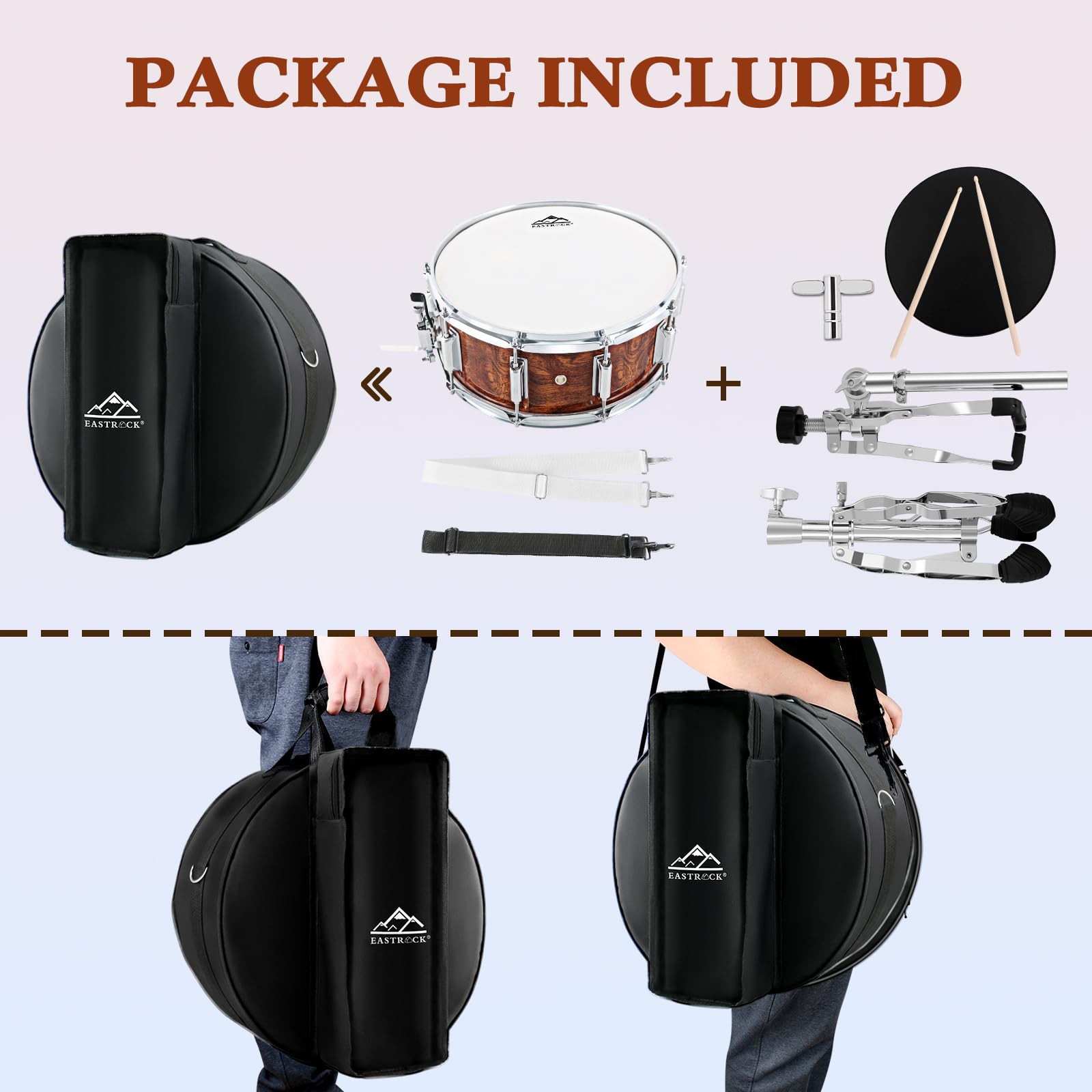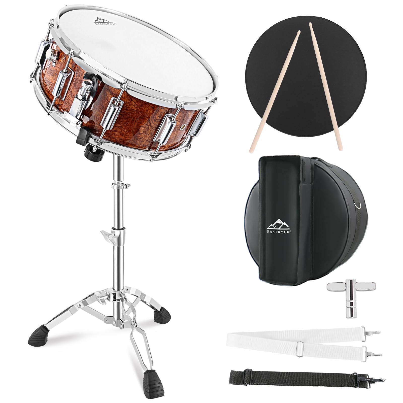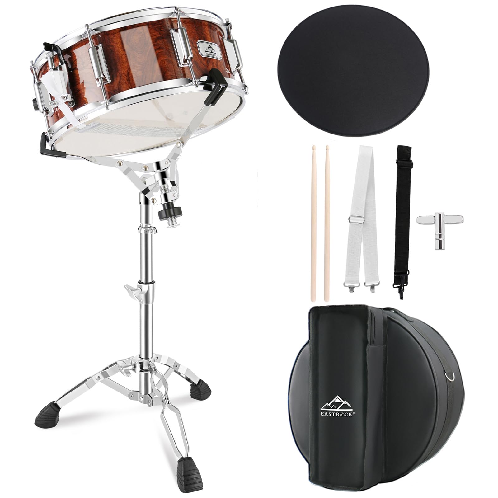 Complete Kit: Include a 14x5.5 inches snare drum with Coated drum head, a padded gig bag, an adjustable stand, a pair of sticks, a drum key and two adjustable neck-straps. 1 set has everything needed, and the stand can be folded and stored into the snare bag, it's portable