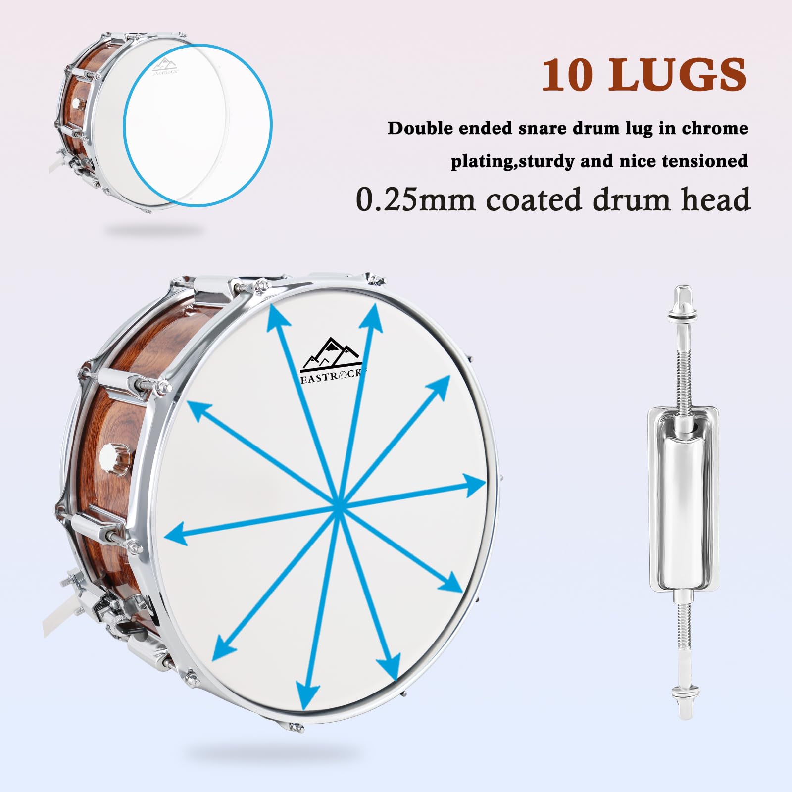 10 Snare Lugs: Upgraded 10 Lugs structure, the degree of integration with the drum shell, as well as the control of its own firmness and durability, provide stable and long-lasting tension for the triple-flange hoop