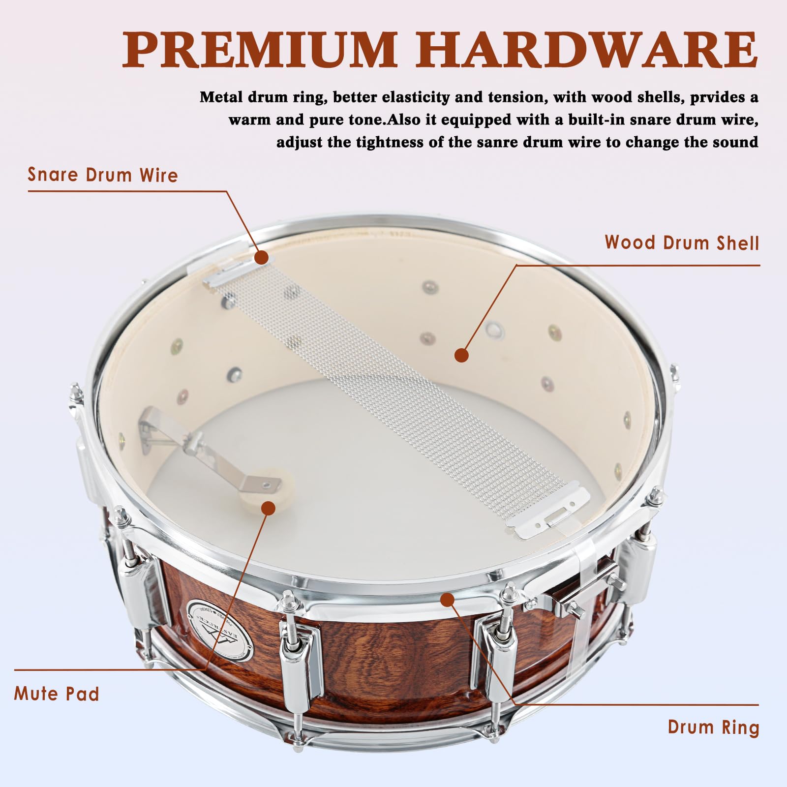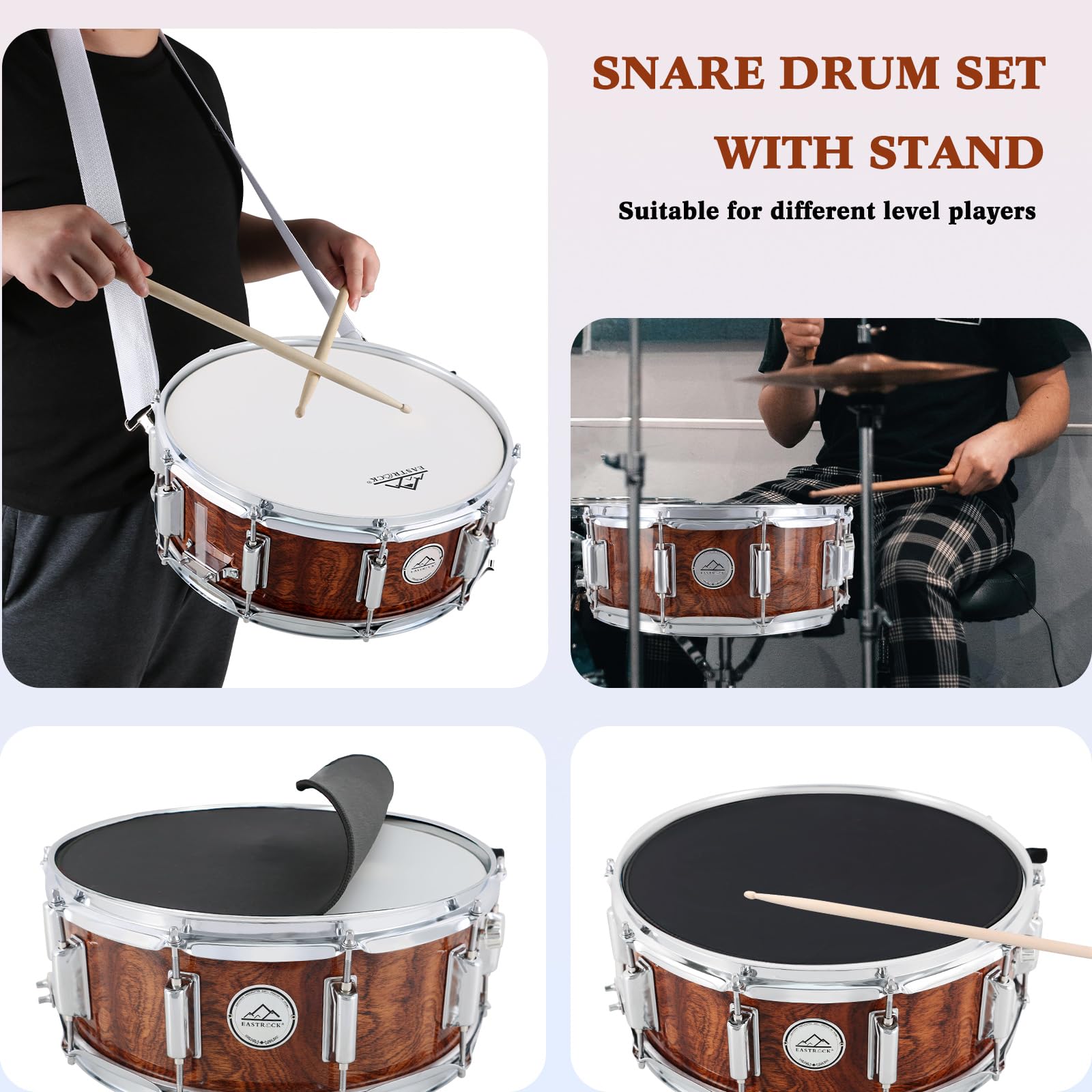 Snare Drum Set: Ideal for any drummer's collection or setup, like beginner, student, professionals, or any level drummers, and this 14x5.5” snare drum is suitable for any drum kit practice and performance, especially Pop music. Its sharp and powerful sound serves as a fantastic snare drum