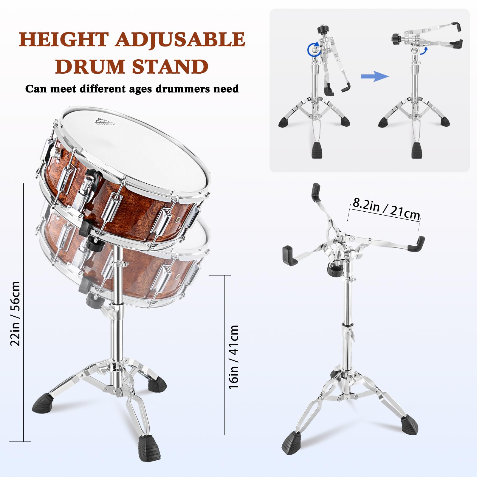 Adjustable Stand: Double-braced legs snare stand with anti-slip rubber feet,and equipped with the rubber faced clamps that means it will not mark your snare whilst holding it securely