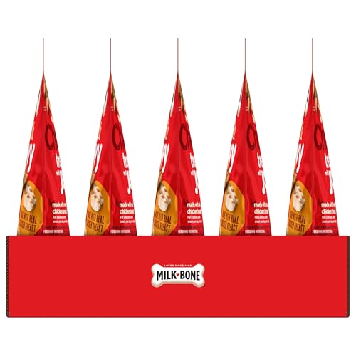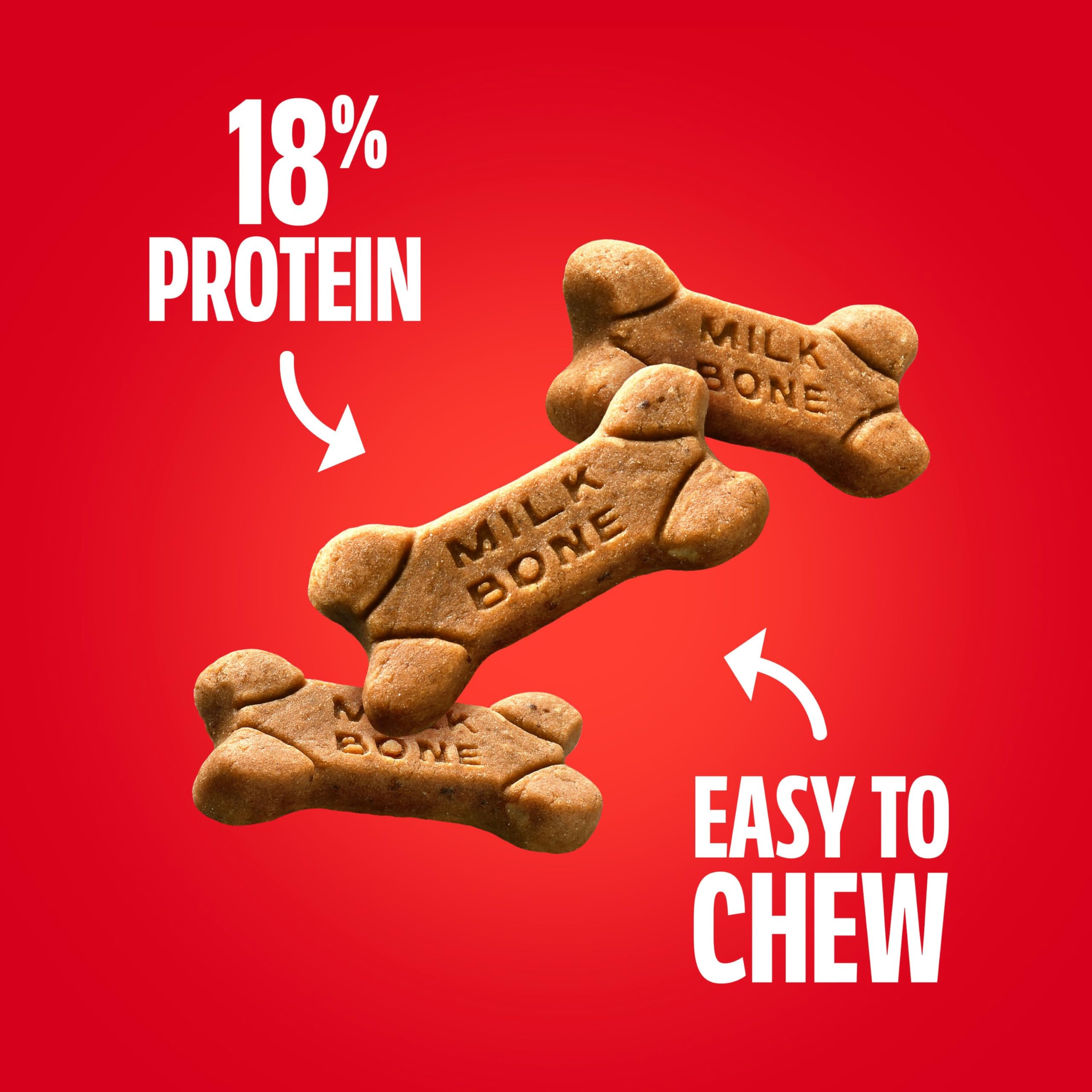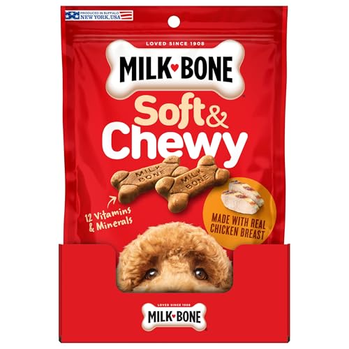 Add a little extra joy to your dog’s day with Milk-Bone Soft & Chewy dog treats. These delicious, tender dog snacks are made with real, savory chicken for a taste your dog craves. They're both tasty and wholesome, with 18% protein and 12 vitamins and minerals, like iron, zinc and B12. And the soft texture makes them easy for dogs of all ages and sizes to enjoy, whether you feed them whole or break into smaller pieces. Baked with love in Buffalo, NY, and Topeka, KS, Milk-Bone Soft & Chewy dog treats are an exciting everyday snack that you can feel good about giving. Try ‘em out to get those tails wagging.