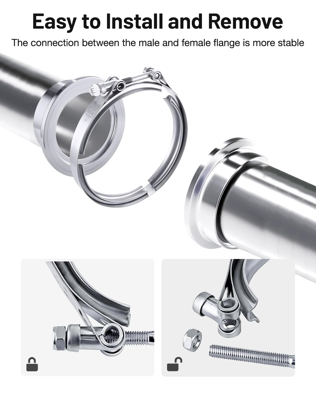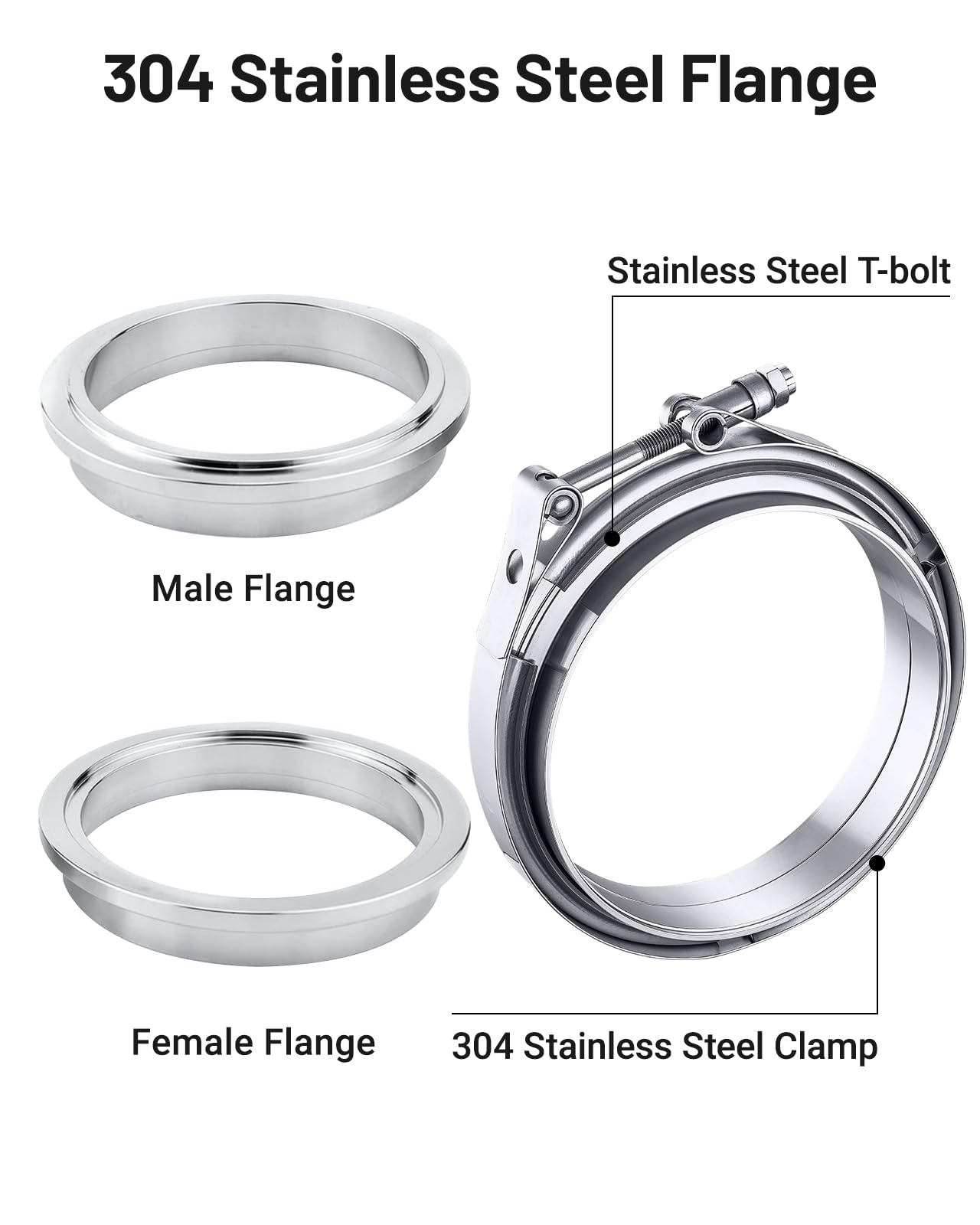 [Material] 304 Stainless steel clamp and flanges,mild steel T-Bolt; 304 stainless steel for long durability and reliability, corrosion resistance and high-temperature resistance