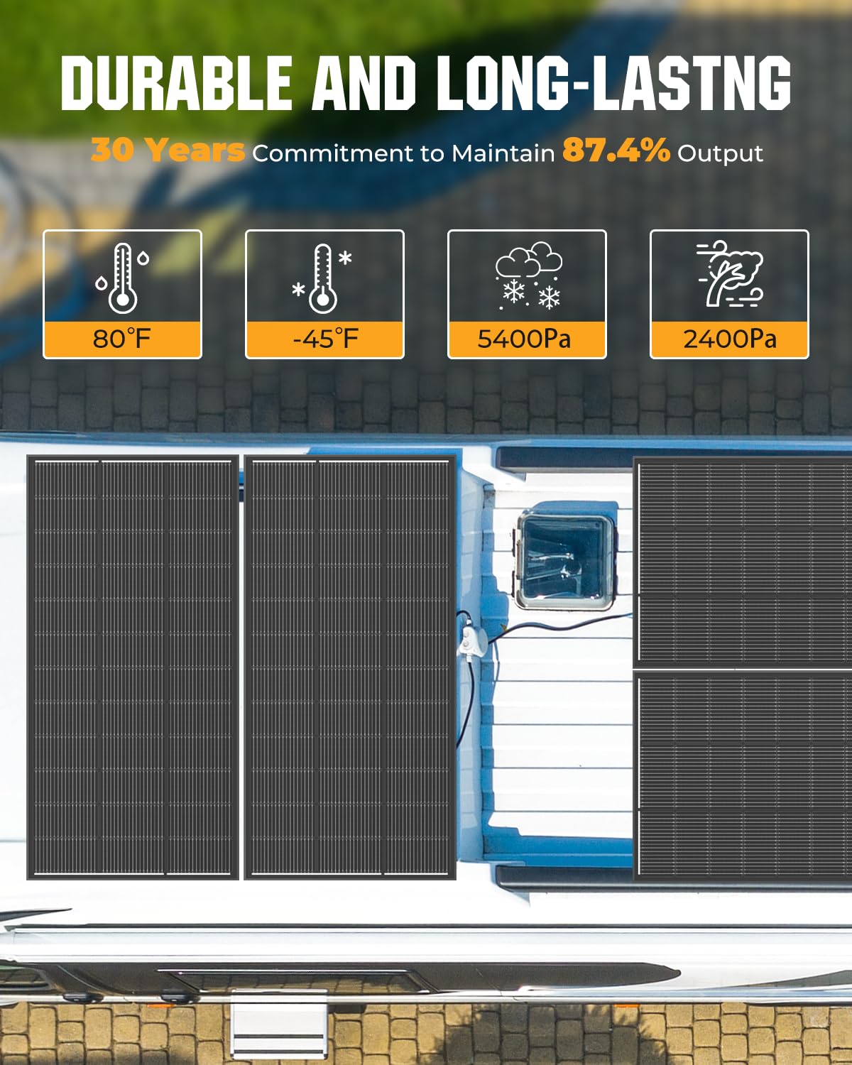 ๐๐จ๐ง๐ ๐๐ข๐๐ ๐๐ง๐ ๐๐ฎ๐ซ๐๐๐ข๐ฅ๐ข๐ญ๐ฒ๏ผThe 12 volt 200 watt solar panel features a corrosion-resistant, electroplated aluminum frame. It can also withstand strong winds of 2400 Pa and snow loads of 5400 Pa. It is IP68 rated for waterproofing, and lab tests have shown it to last more than 30 years.