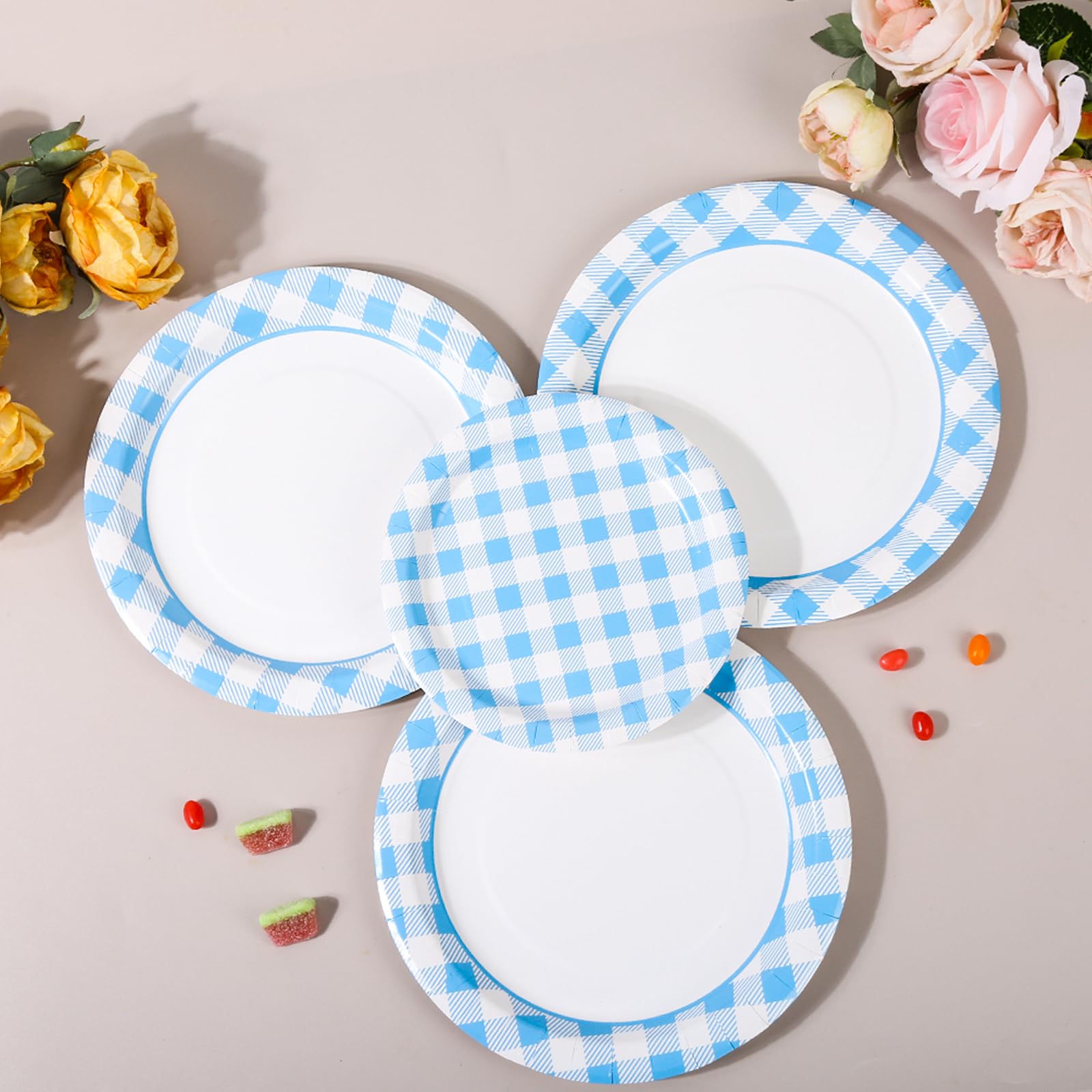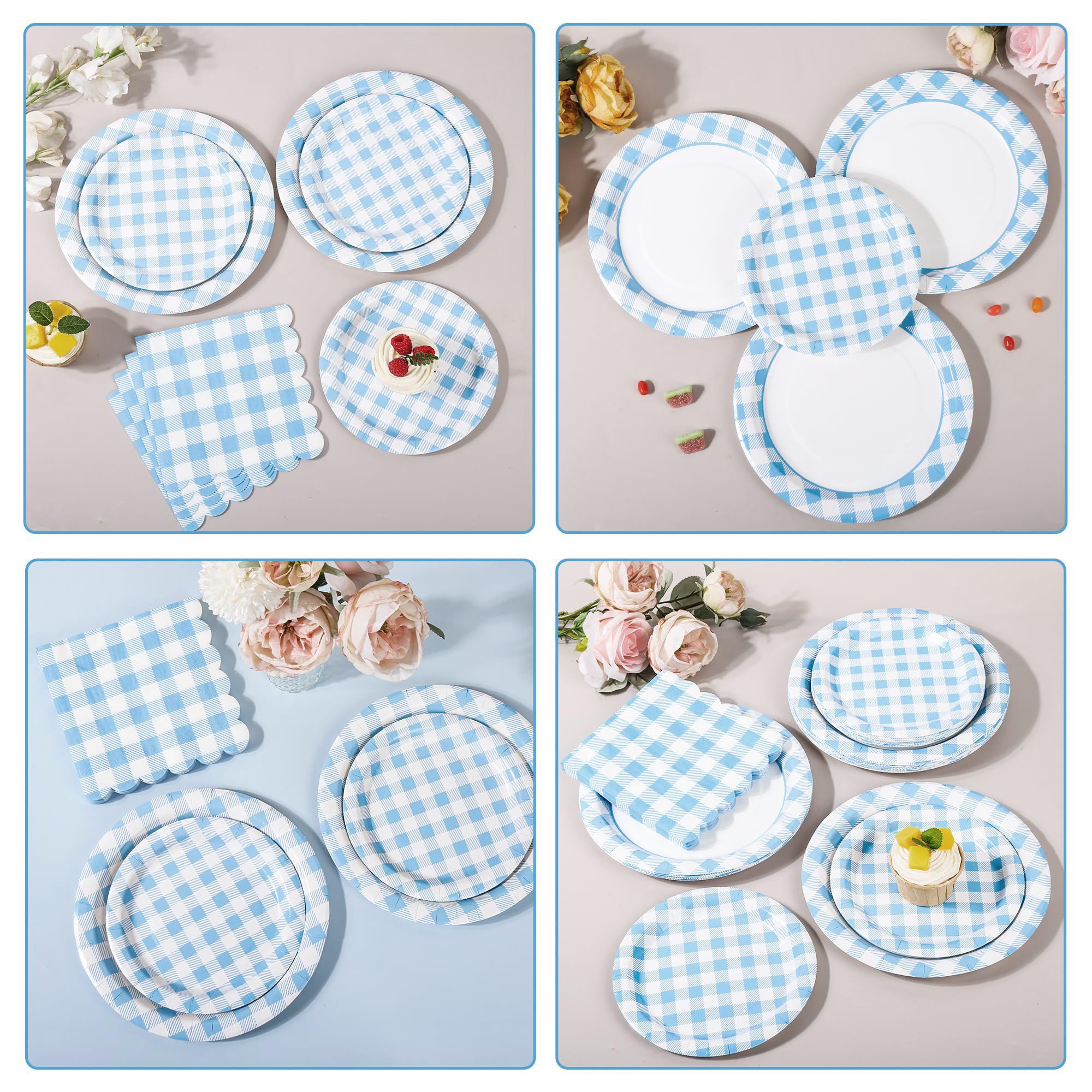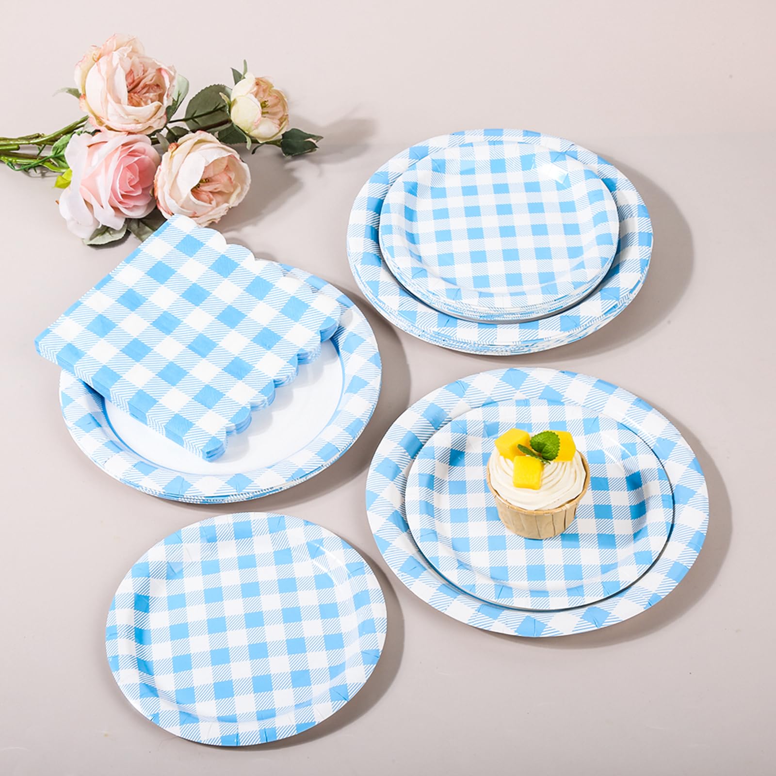 ALL OCCASIONS DINNERWARE: Our plaid blue paper plates are suitable for birthday family fall picnic BBQ Party or any special event. The design of the light blue gingham color plate looks eco-friendly and safe, adding more charm to your party.