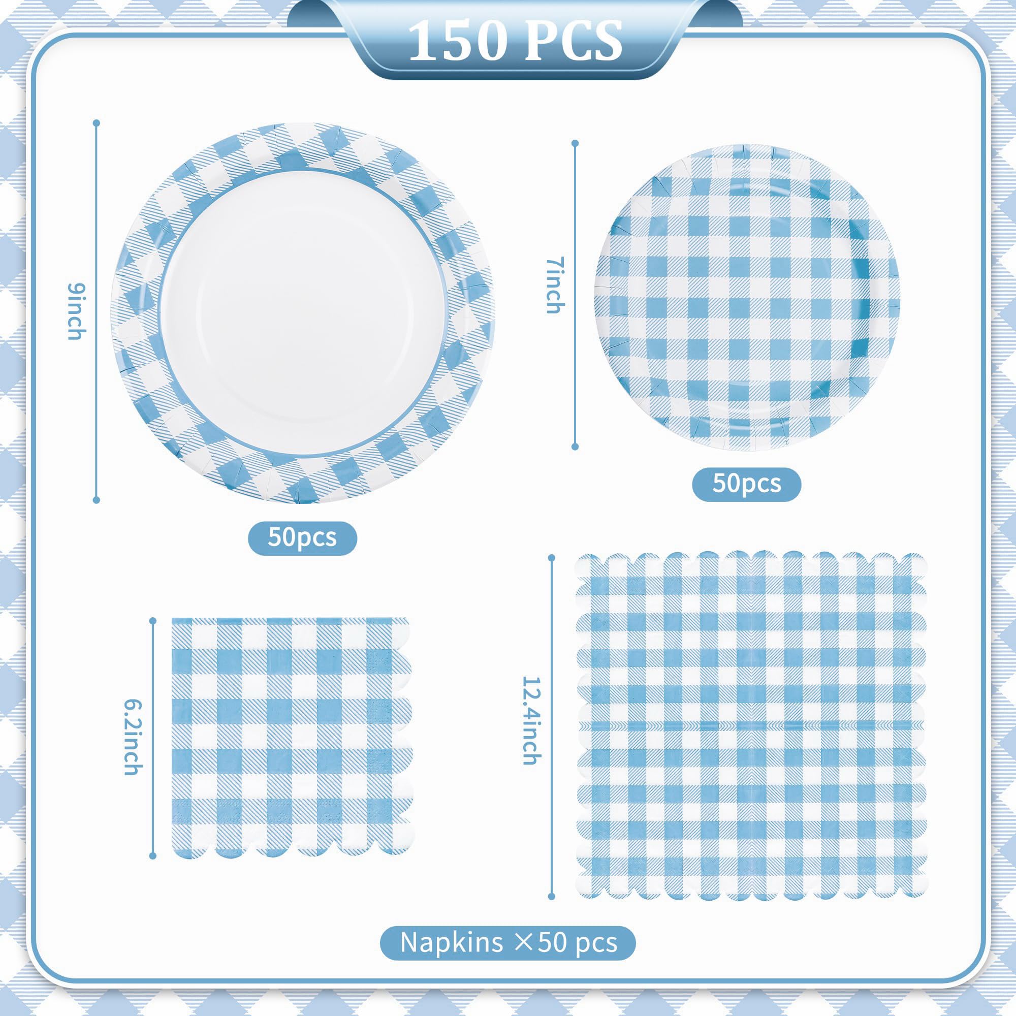 WHAT’S IN THE BOX: Complete set with 9" light blue gingham plates*50,7"blue checkered dessert plates*50,blue gingham napkins (6.2" x 6.2") *50, These blue gingham party decorations are an excellent way to entertain guests, light blue plaid not only makes people feel comfortable, but also brings joy to their mood. Durable blue plaid party disposable plates napkins sets allow you to SERVES 50 GUEST at one time