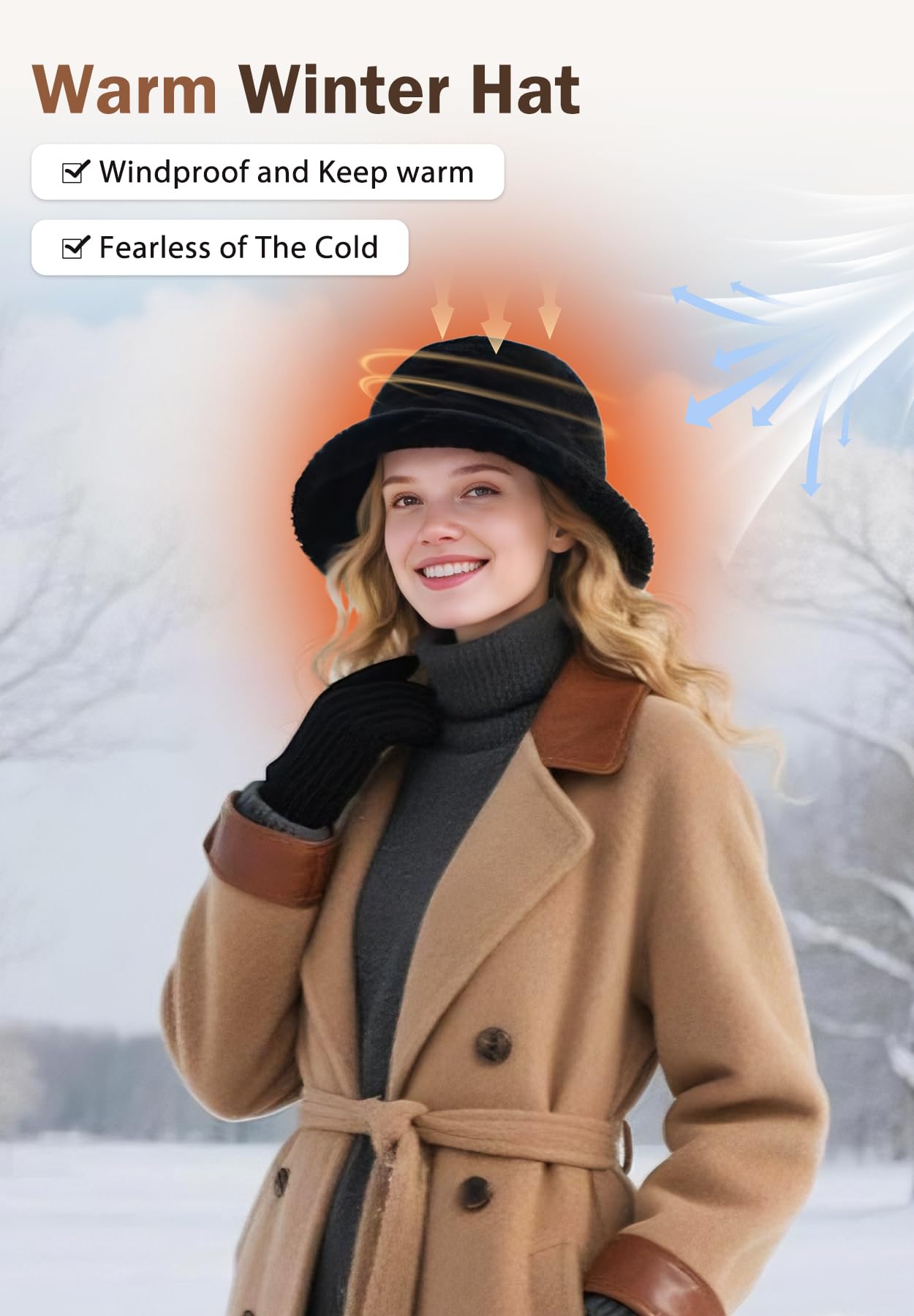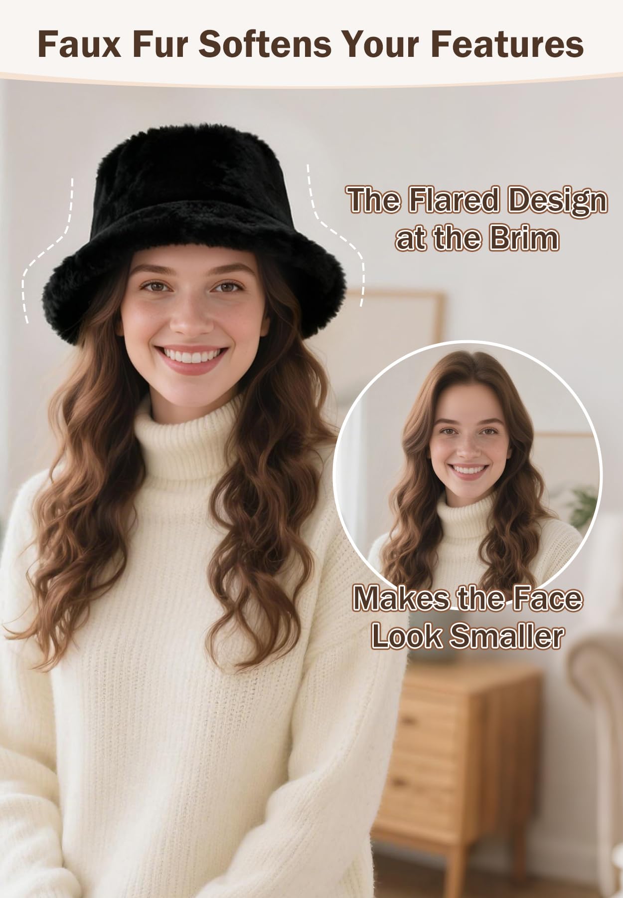 The Flared Design at the Brim: No matter what your head shape or face shape is, can you perfectly wear this furry winter hat. Faux fur softens your features, makes the face look smaller. Wearing it is like having a face-slimming filter on, looking both beautiful and fashionable.