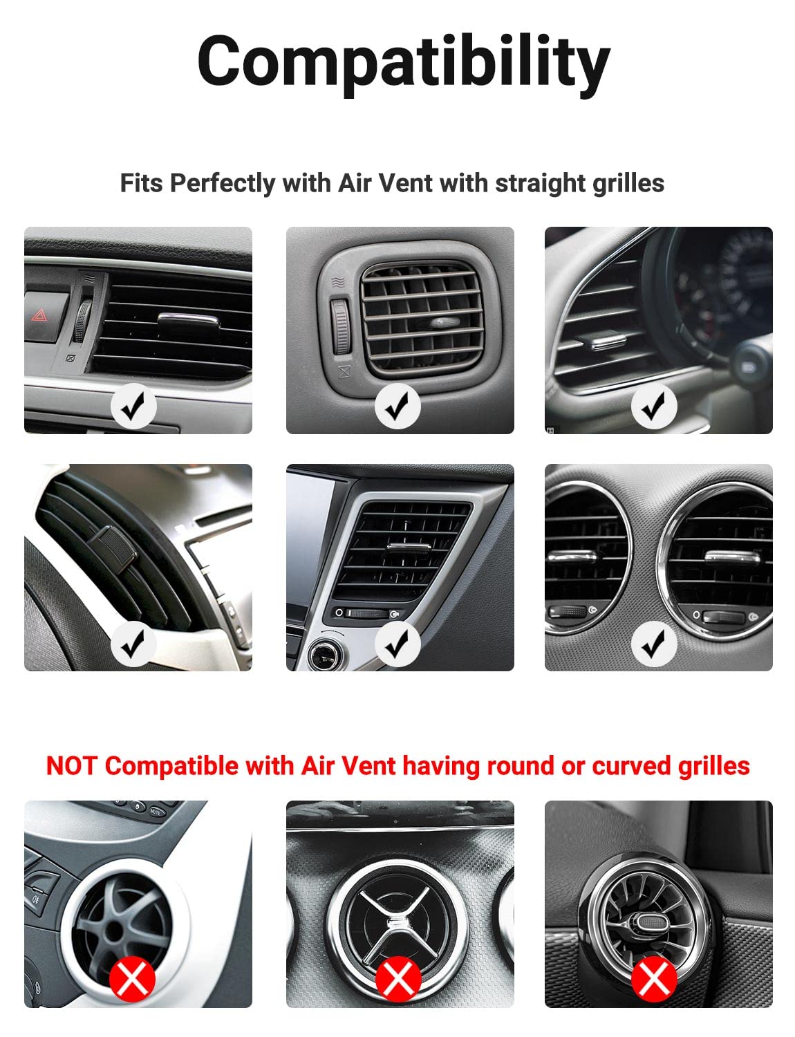 Compatibility: Perfectly fits with Air Vent with straight grilles. NOT Compatible with Air Vent having round, arc or curved grilles
