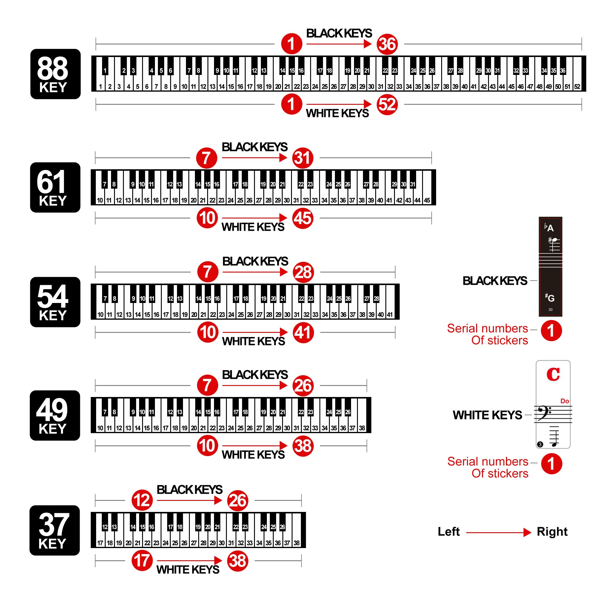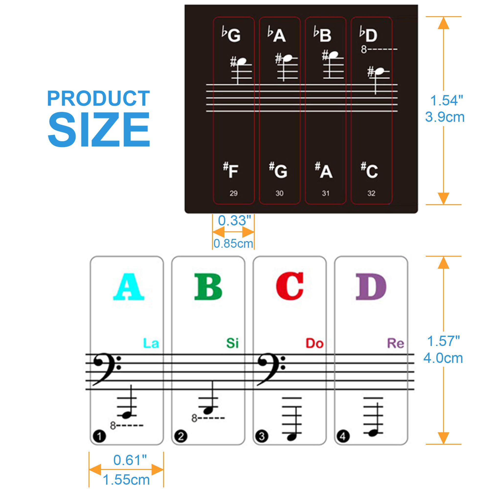 🎹 Size: Suitable for all 88/61/54/49/37 key pianos and keyboards. White key sticker 4.0cmX1.55cm(1.57”X0.61”). Black key sticker 3.9cmX0.85cm(1.54”X0.33”).