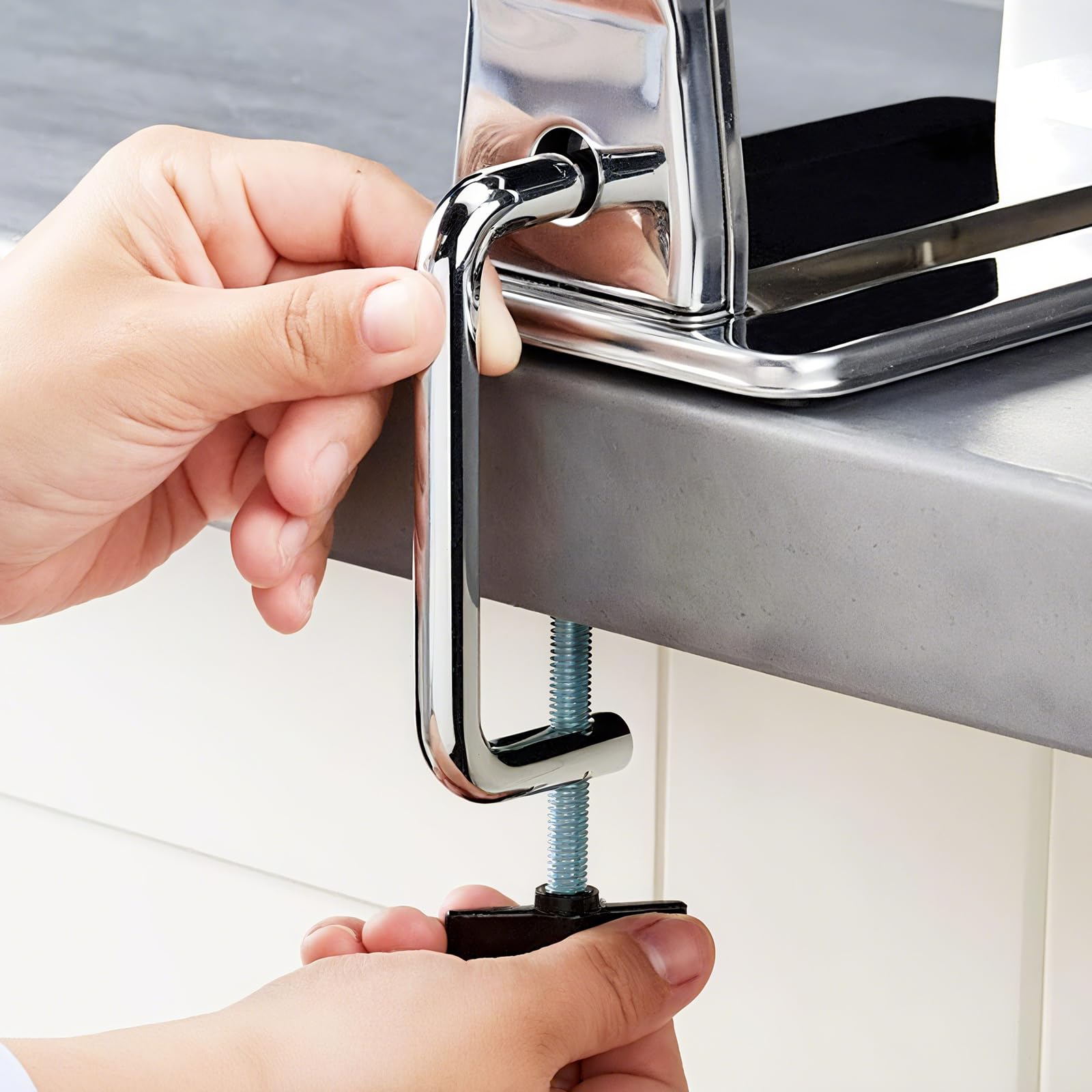 Countertop clamp and instructions included: The countertop clamp helps grip the machine firmly to the edge of a counter. The instructions will guide you through assembling the machine, using it to make pasta, and maintaining the pasta maker.