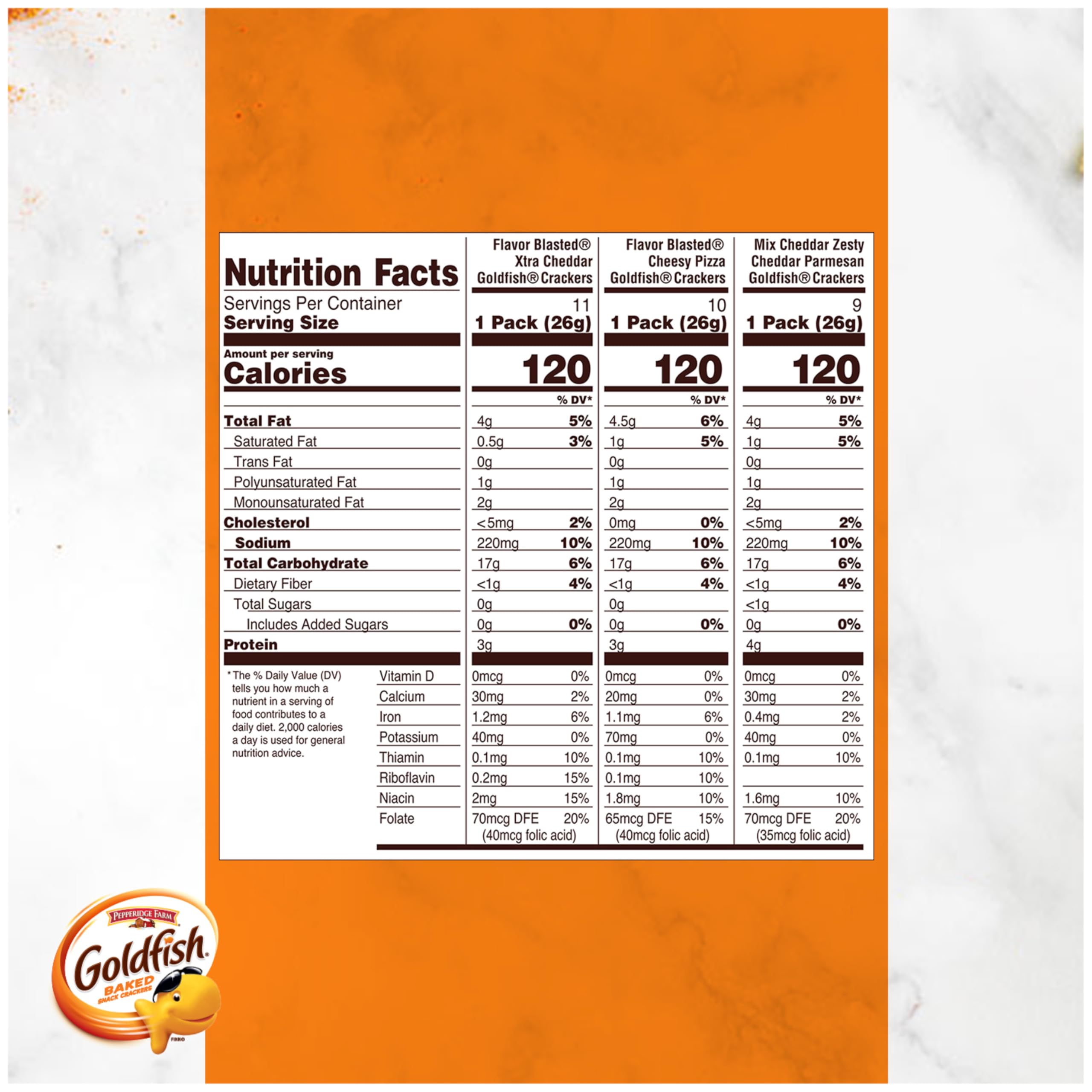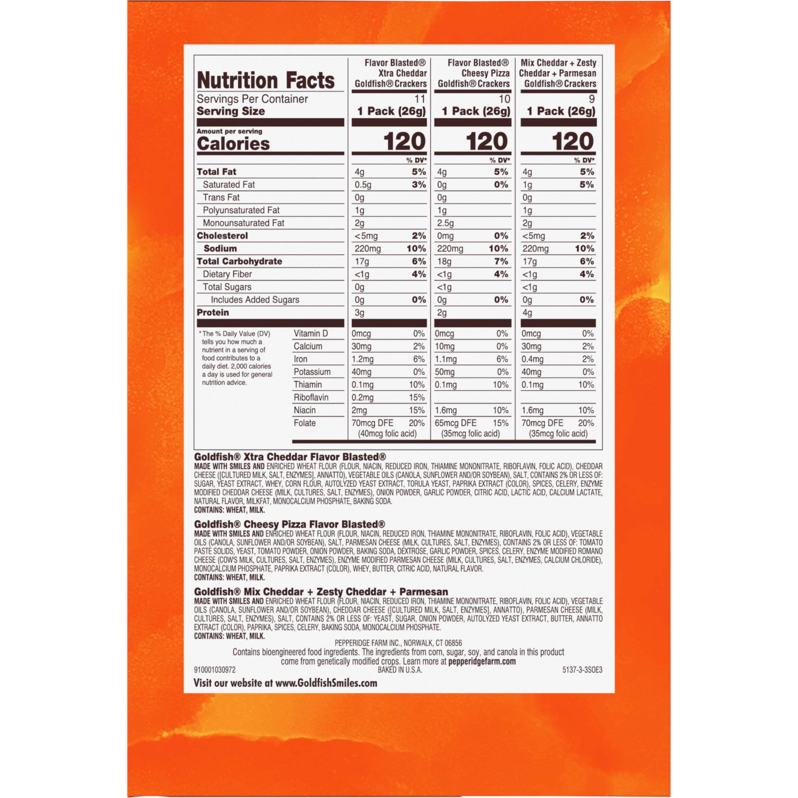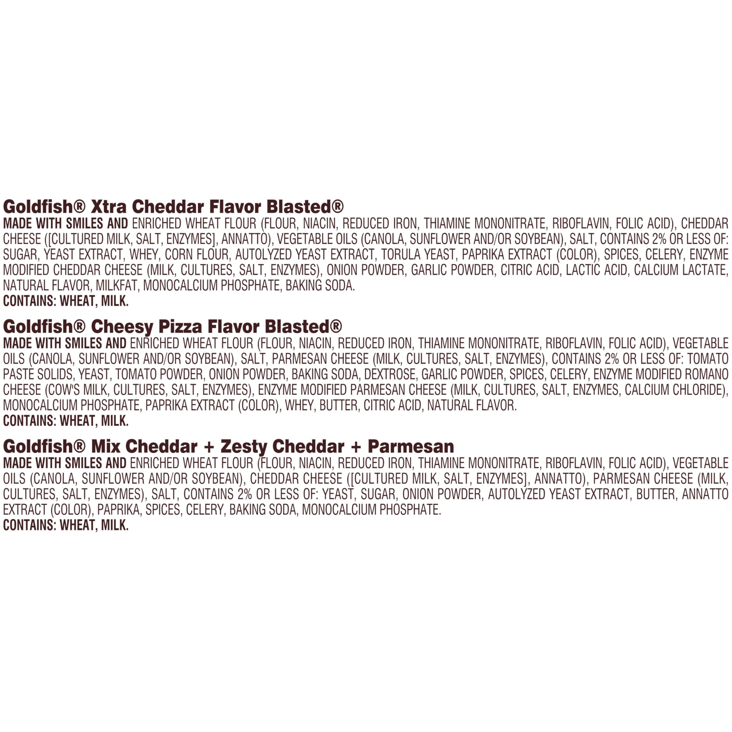 Includes: 9 packs of Goldfish mix cheddar/zesty cheddar/parmesan, 11 packs of Goldfish flavor blasted xtra cheddar, 10 packs of Goldfish flavor blasted cheesy pizza