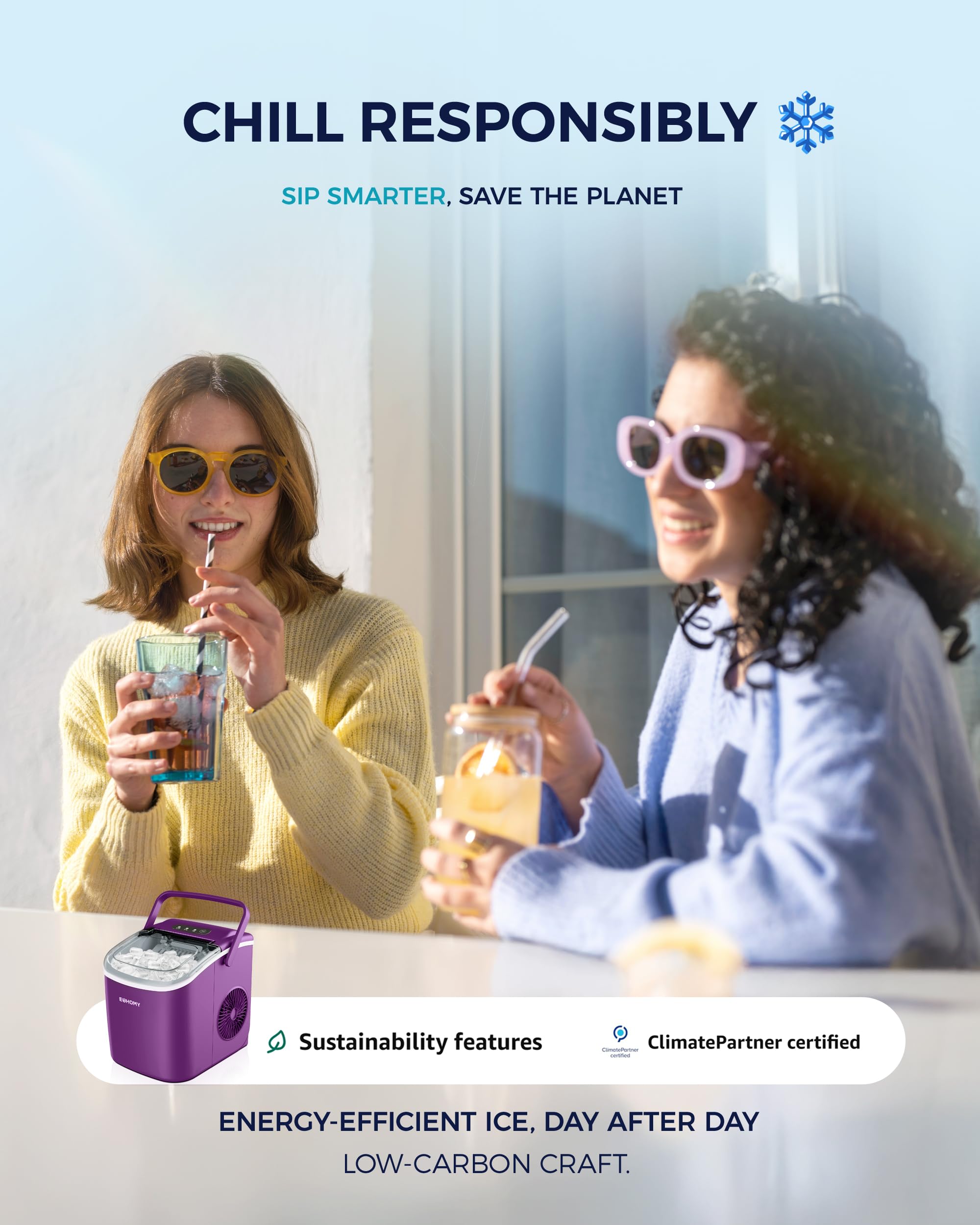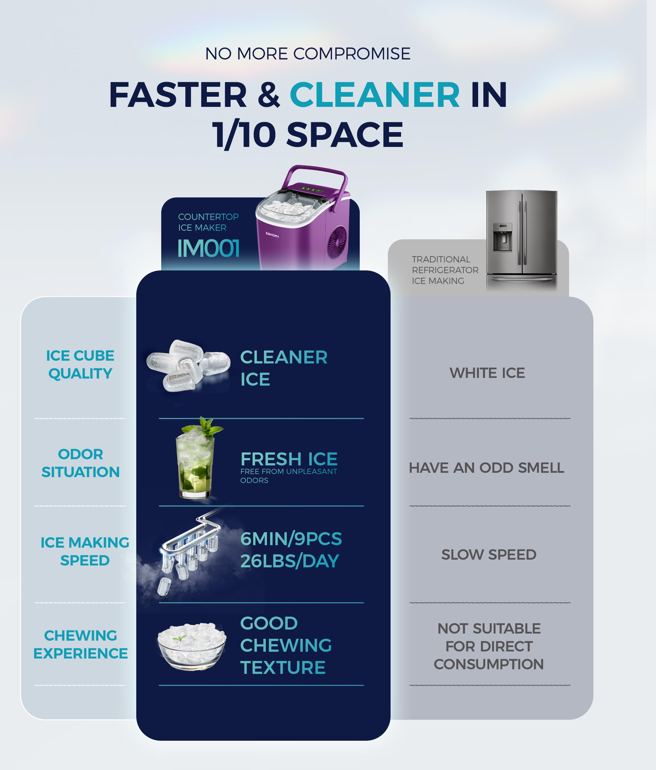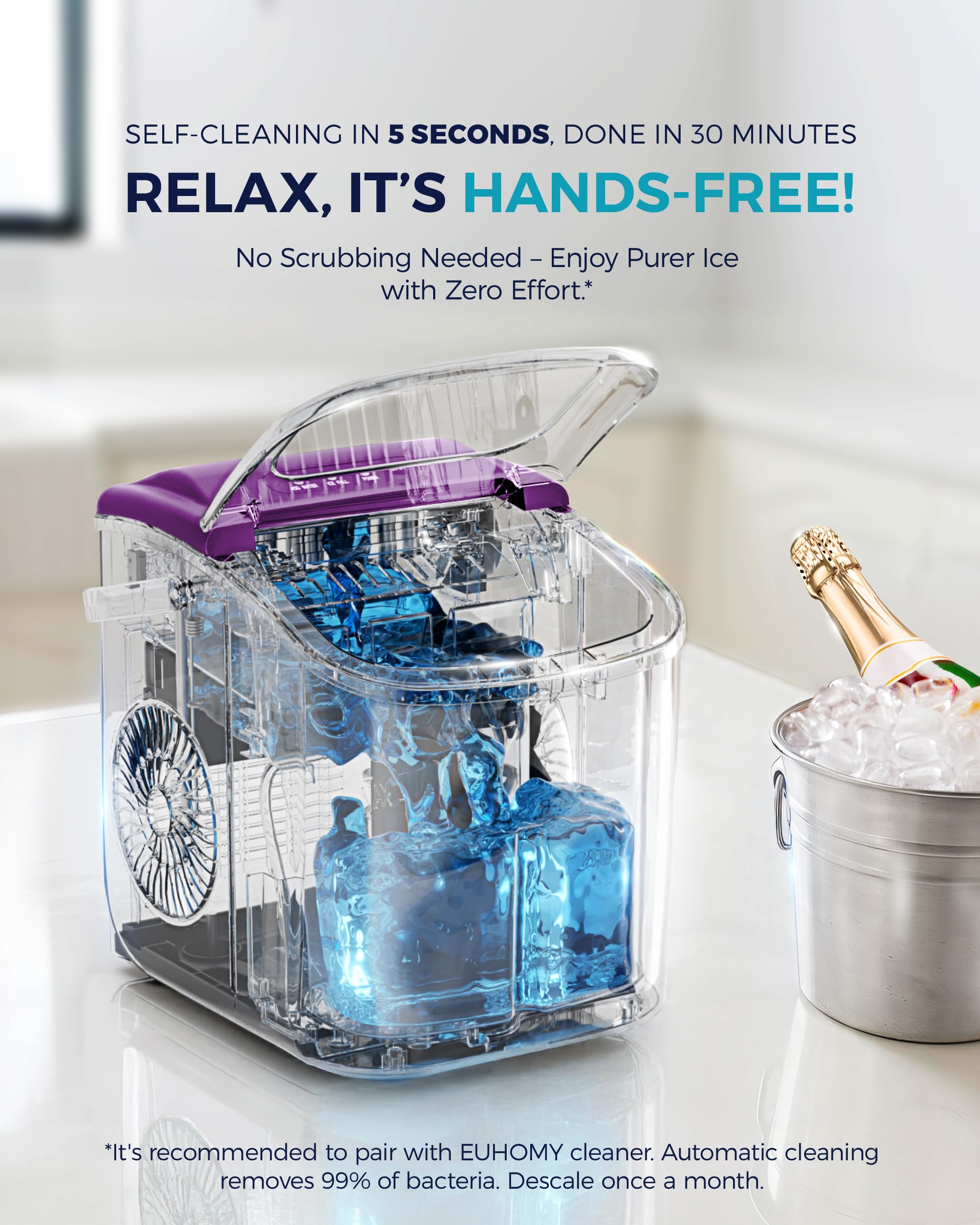 Smart Operation & Self-Cleaning: The ice maker has advanced infrared sensor. The "ICE FULL" indicator flashes remind you to take out ice to prevent overflowing when the basket is full. And it'll remind you to add water by flashing "ADD WATER". Additionlly, the compact ice maker has a one-touch auto-cleaning function. Press the “ON/OFF” for 5s after adding water to run automatic mode for 30mins. Just get a clean ice maker without washing it by yourself