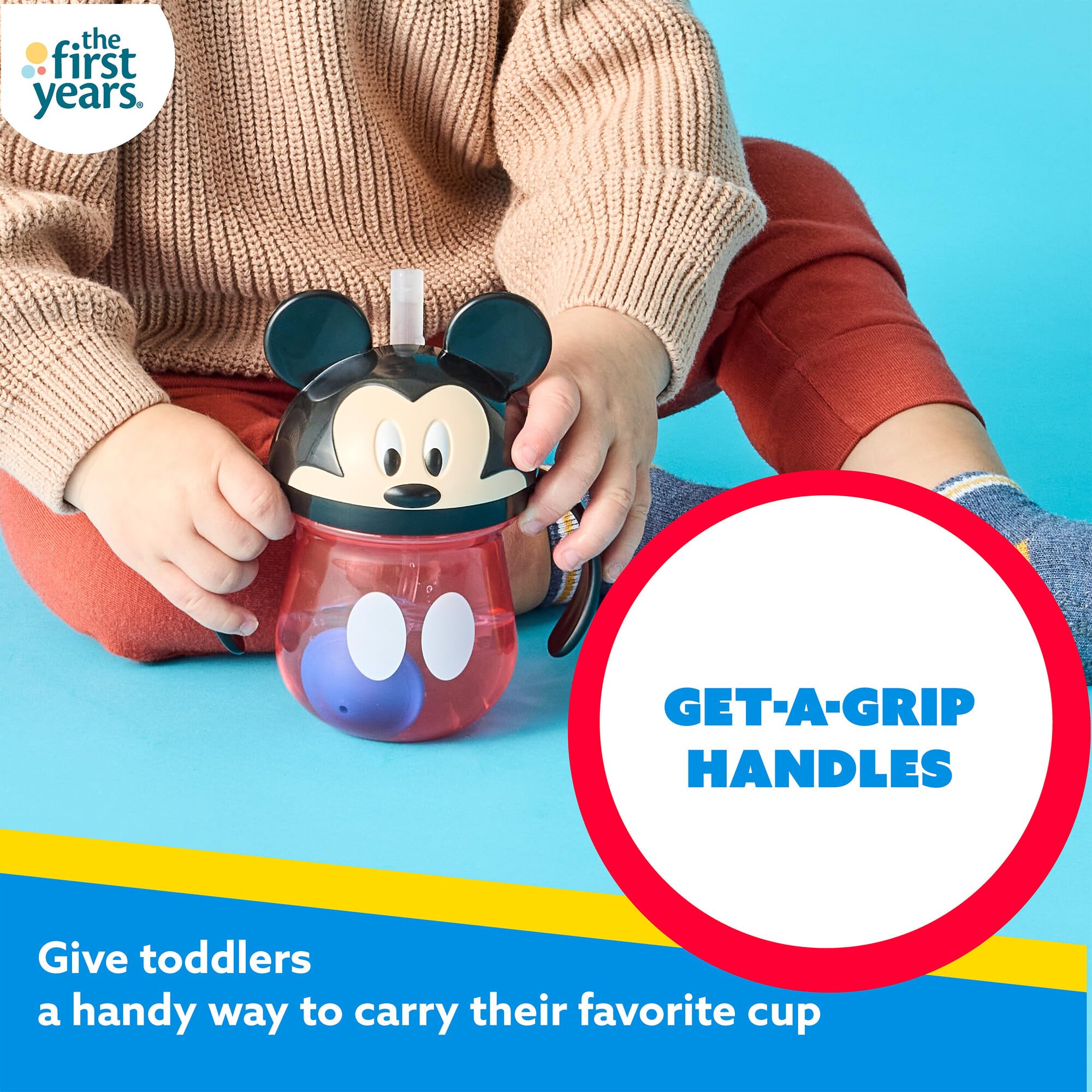 Mickey helps babies learn to sip from a straw with The First Years Weighted Straw Sippy Cup! This baby sippy cup makes sure no drop is left behind thanks to the weighted straw that stays in the liquid for easy sipping as your baby learns to drink. Even if the straw cup tips from side to side, the weight stays in the right place, making it easy for toddlers to get a sip whenever they want one. Whether they're spending the day at home, out at the park, or heading to daycare, this toddler cup's training handles are designed for little hands to hold on to. Their new favorite sippy cup also has a flip-top cover over the straw that does double duty by keeping the straw clean and the drink inside the cup. (Great for your toddler on the go!) Your little one will love having Mickey by their side as they sip, and you'll love the dishwasher-safe design that makes this trainer cup easy to keep clean. This spill proof sippy cup is made without BPA for toddlers learning to sip ages 6 months and up.