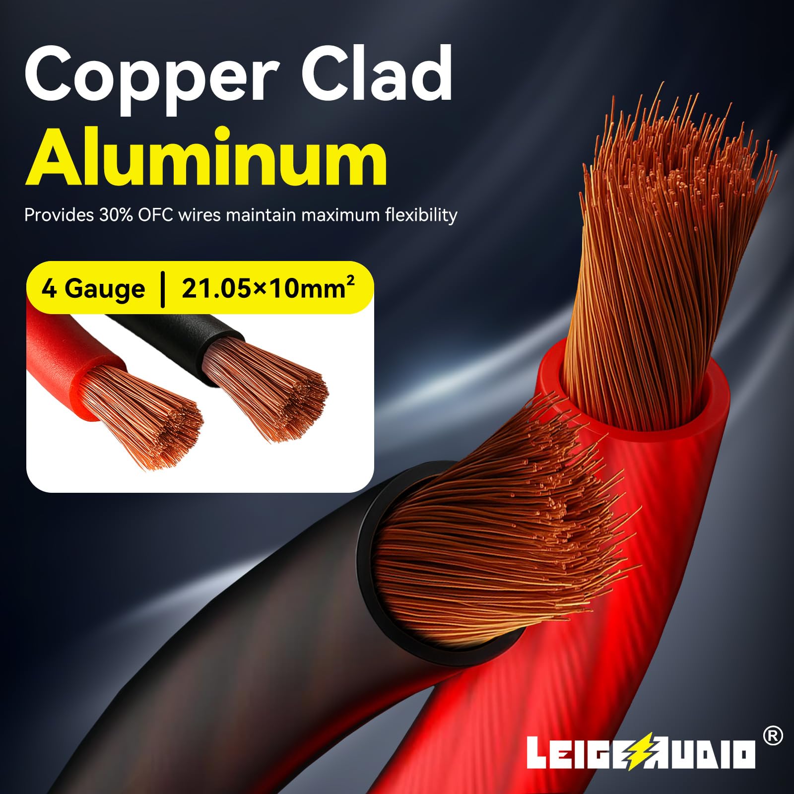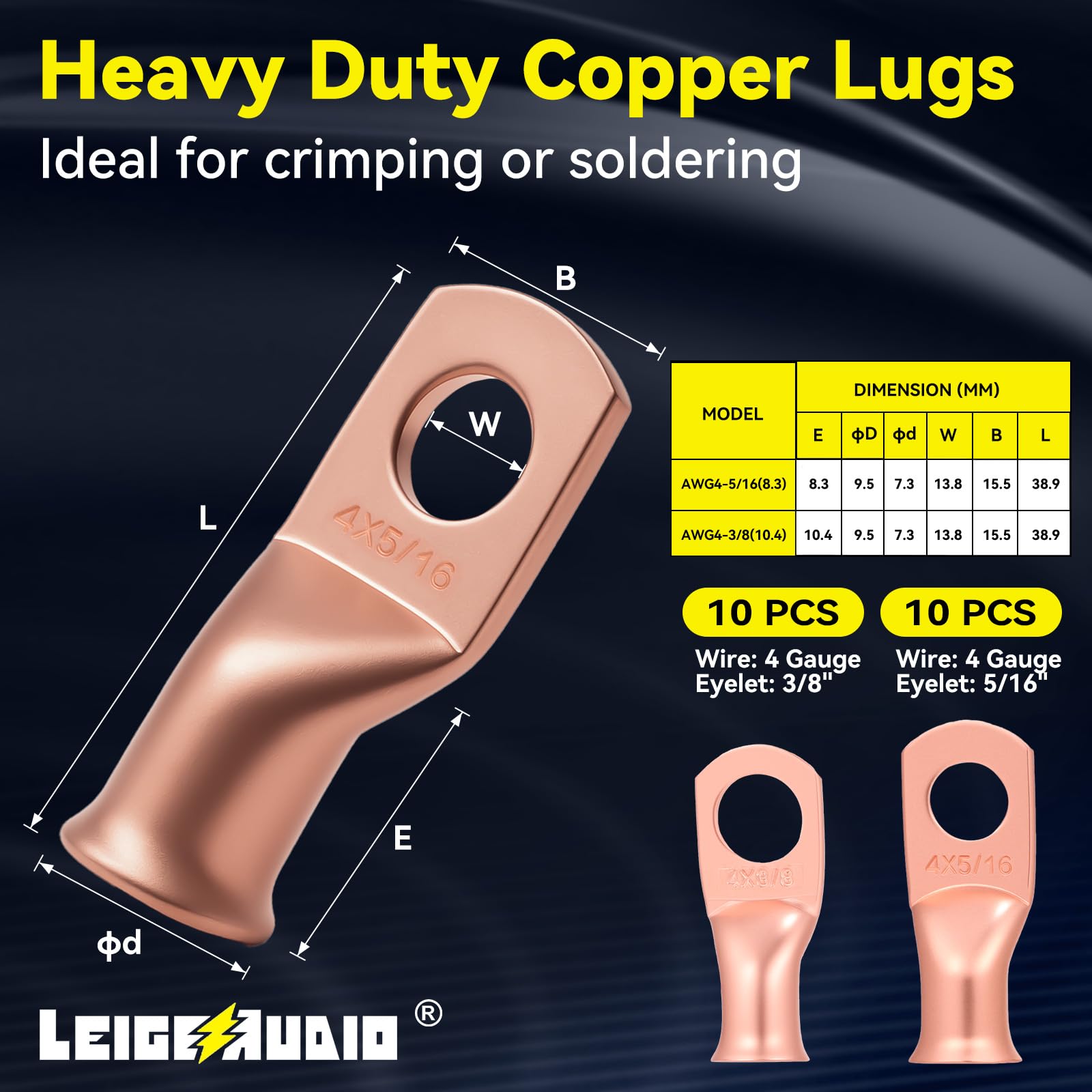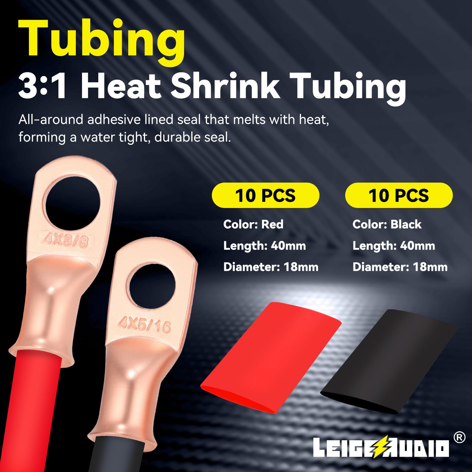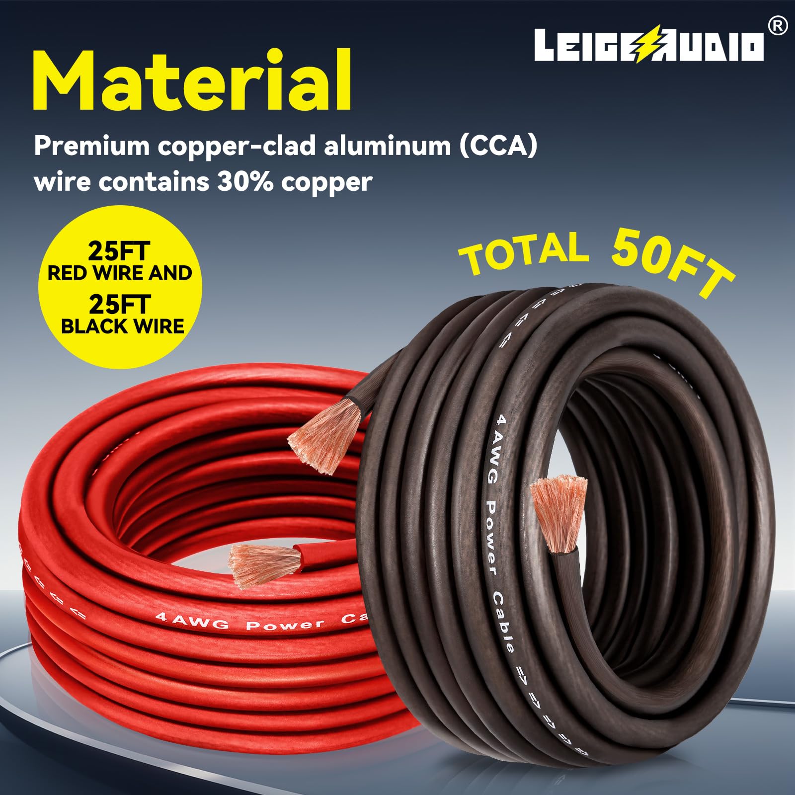 ➤ LEIGESAUDIO True 4 AWG Gauge wire, passed extreme heat tested. Includes 25FT (7.62m) of each color Black & Red, 10pcs SC25-10(AWG4-3/8), 10pcs SC25-8(AWG4-5/16) Copper Cable Lugs, 20pcs 3:1 Adhesive Lined Hest Shrink Tubing