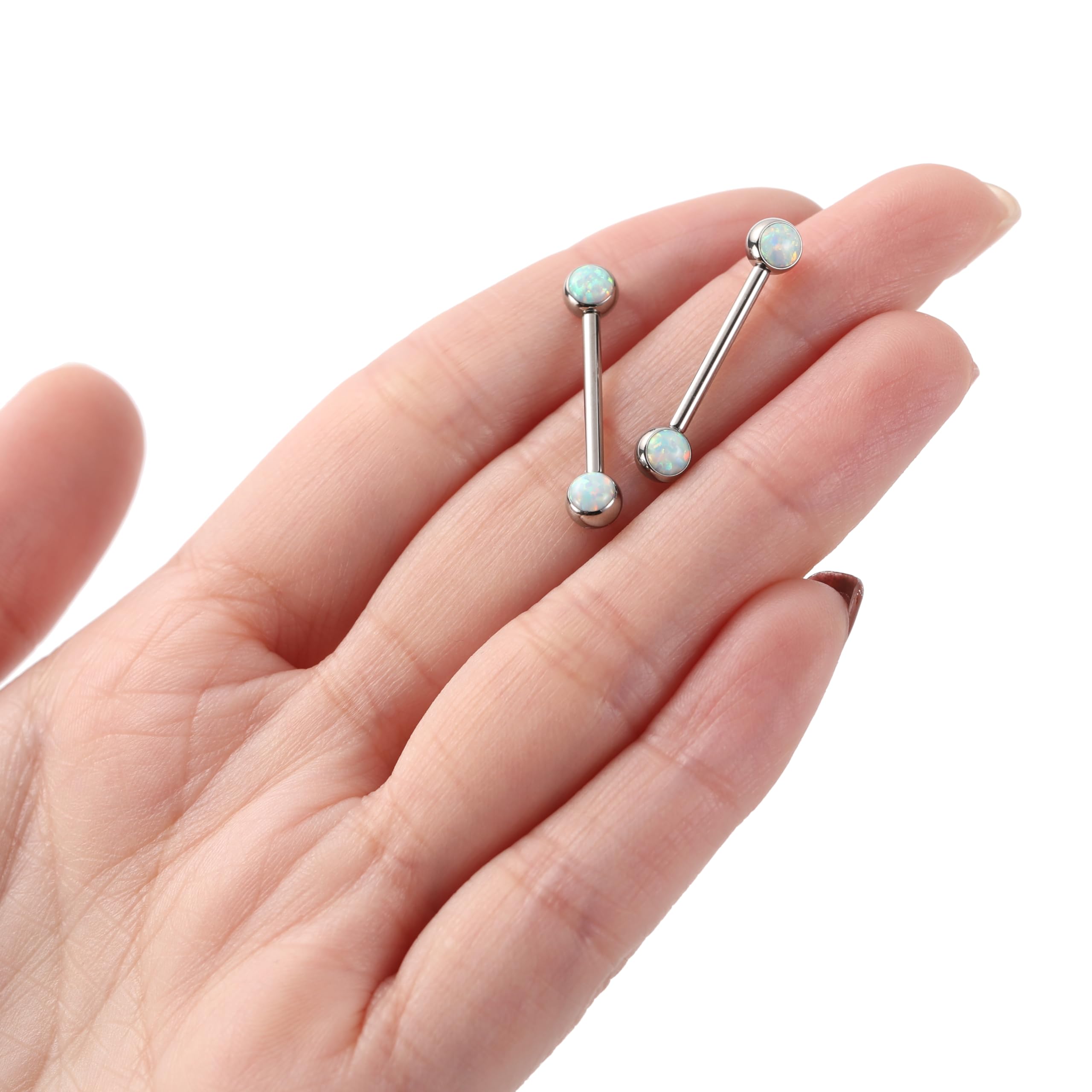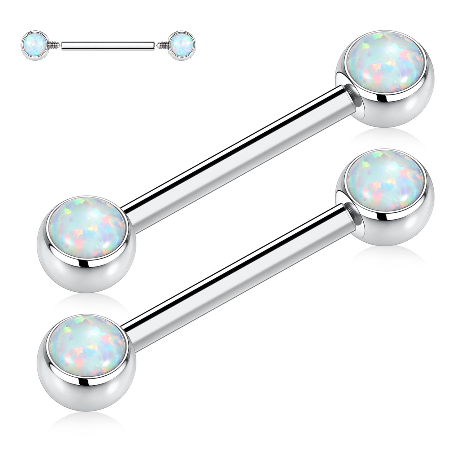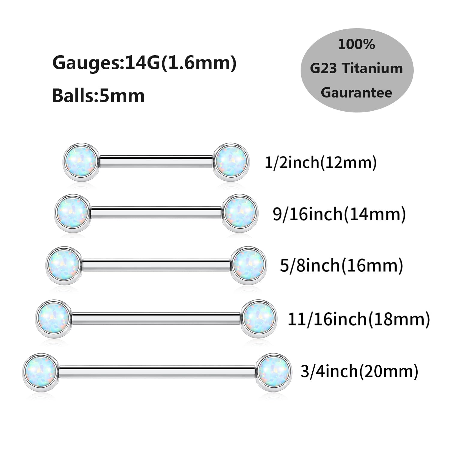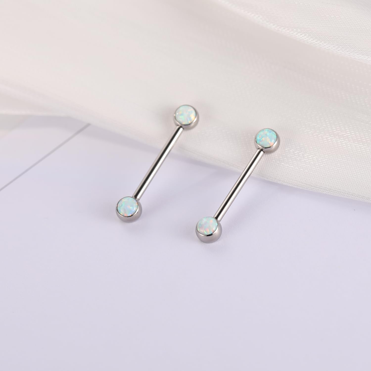 Size and Color: gauge: 14G (1.6 mm); Nipple Barbell Length: 5/8"(16 mm); CZ Size: 5 mm. Color: Silver with white opal. 2pcs nipple rings per order