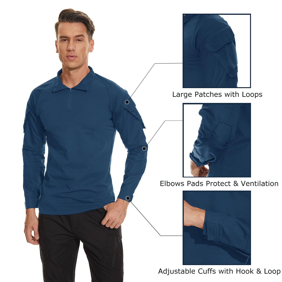 【Adjustable Personalized Designs】: This tactical shirt features multiple personalized and adjustable designs, including a 1/4 smooth zip and windproof stand collar. Also, the hook & loop cuffs improve the range of motion. Additionally, there are large patches on both arms for personalized patches, and there is a designated area for inserting elbow pads (not included) to provide extra protection and ventilation.