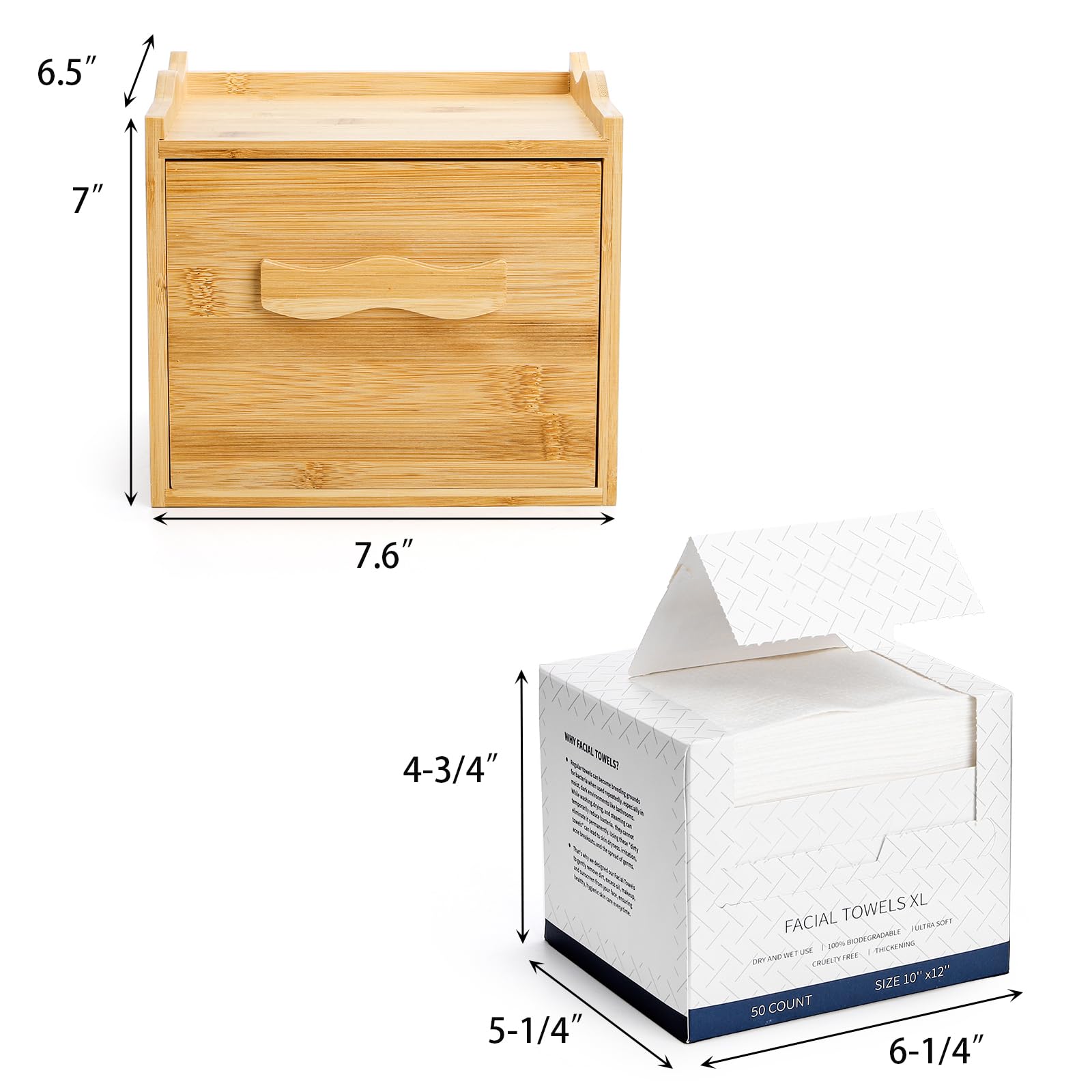 The size of bamboo face towel container is 7.75 x 6.5 x6.5 inches, large enough for storing XL disposable face towels, makeup removing wipes and other skin care storage. The flat top with raised edge prevents things from falling over, suitable for placing cleaning or skincare products, expanding your bathroom storage space.