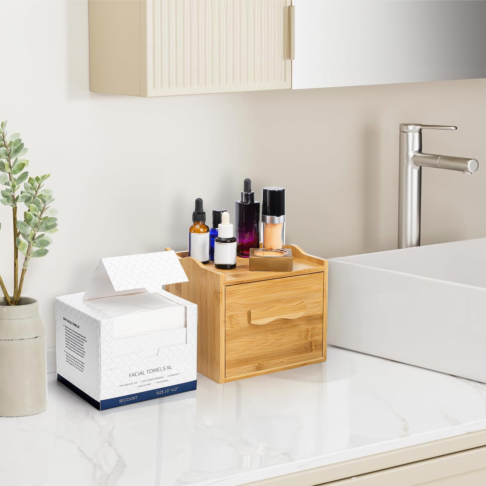 Package includes 1 pcs Bamboo box for disposable face towels, 50 counts XL disposable face towels and 4 anti-slip rubber feet. You can apply them to the bottom to stay stability on any surface.