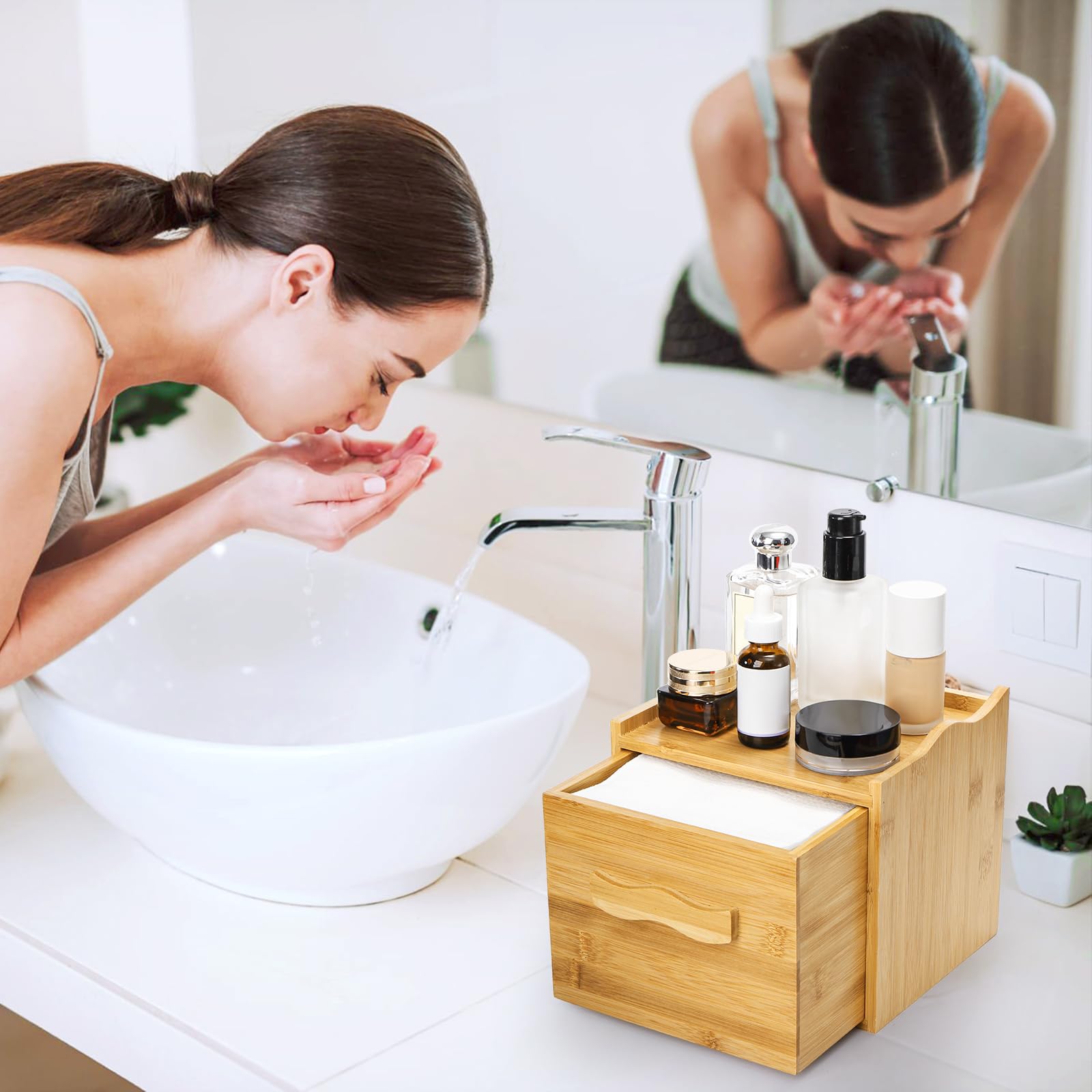 This bamboo storage box for clean skin towels is made of high quality bamboo wood, reusable and sturdy, featuring a drawer to keep towels clean and dry, the wave handle makes it easy to pull out the drawer and easy access to your facial towels.