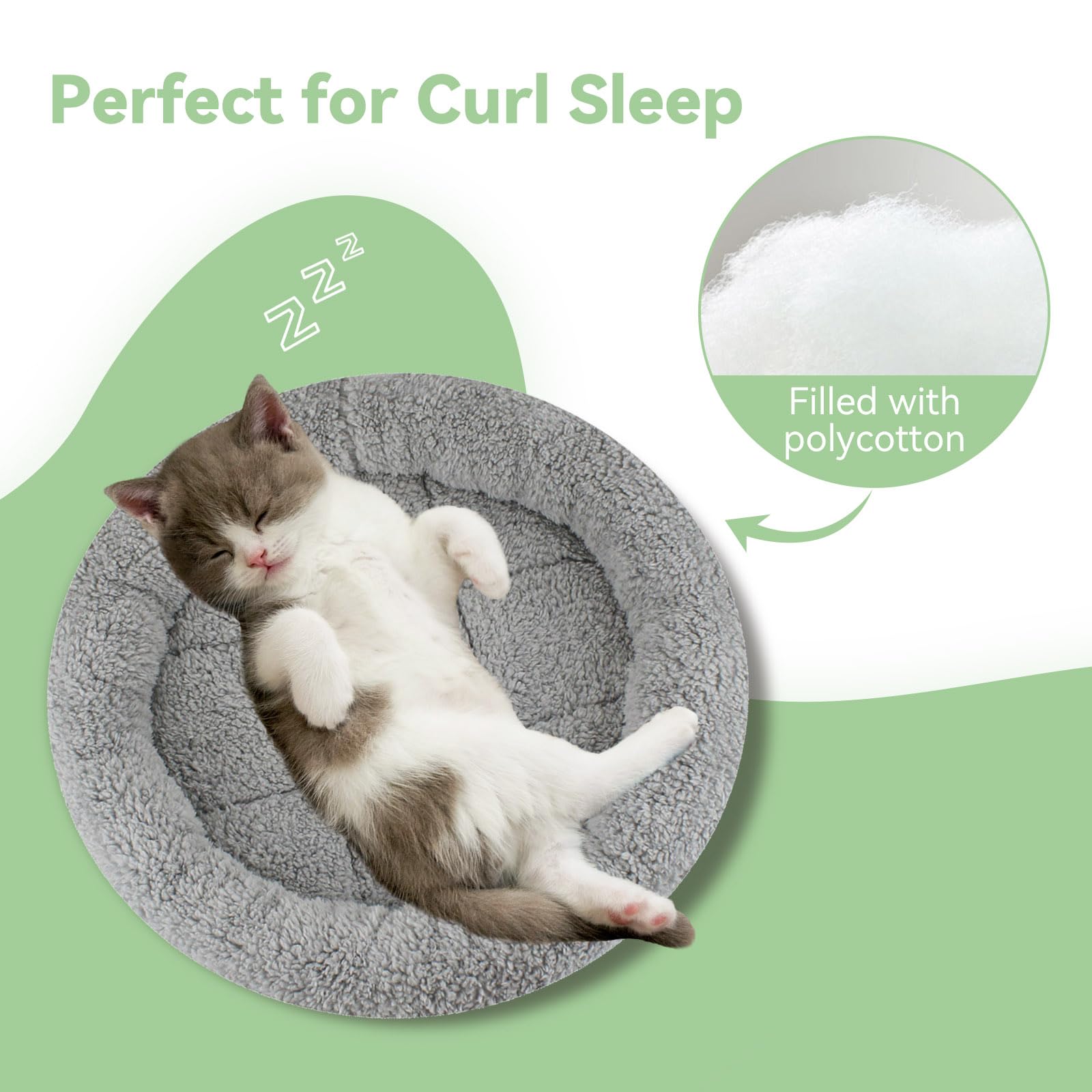 Better Sleep: This round cat mat design with raised edges around, create a sense of security and support to cat’s head and neck, The ideal place for small pets to relax and sleep! Perfect for cat who like curl sleep.