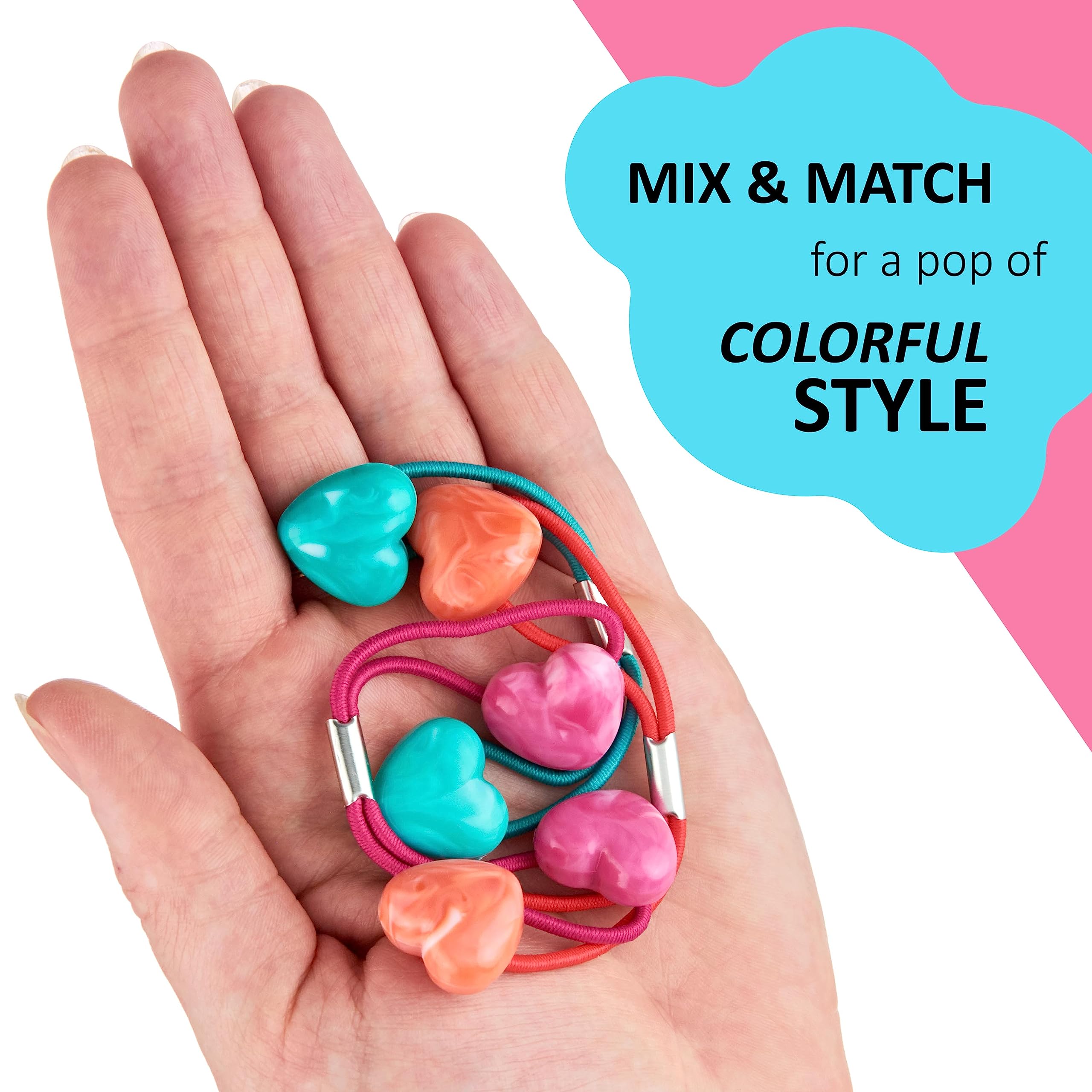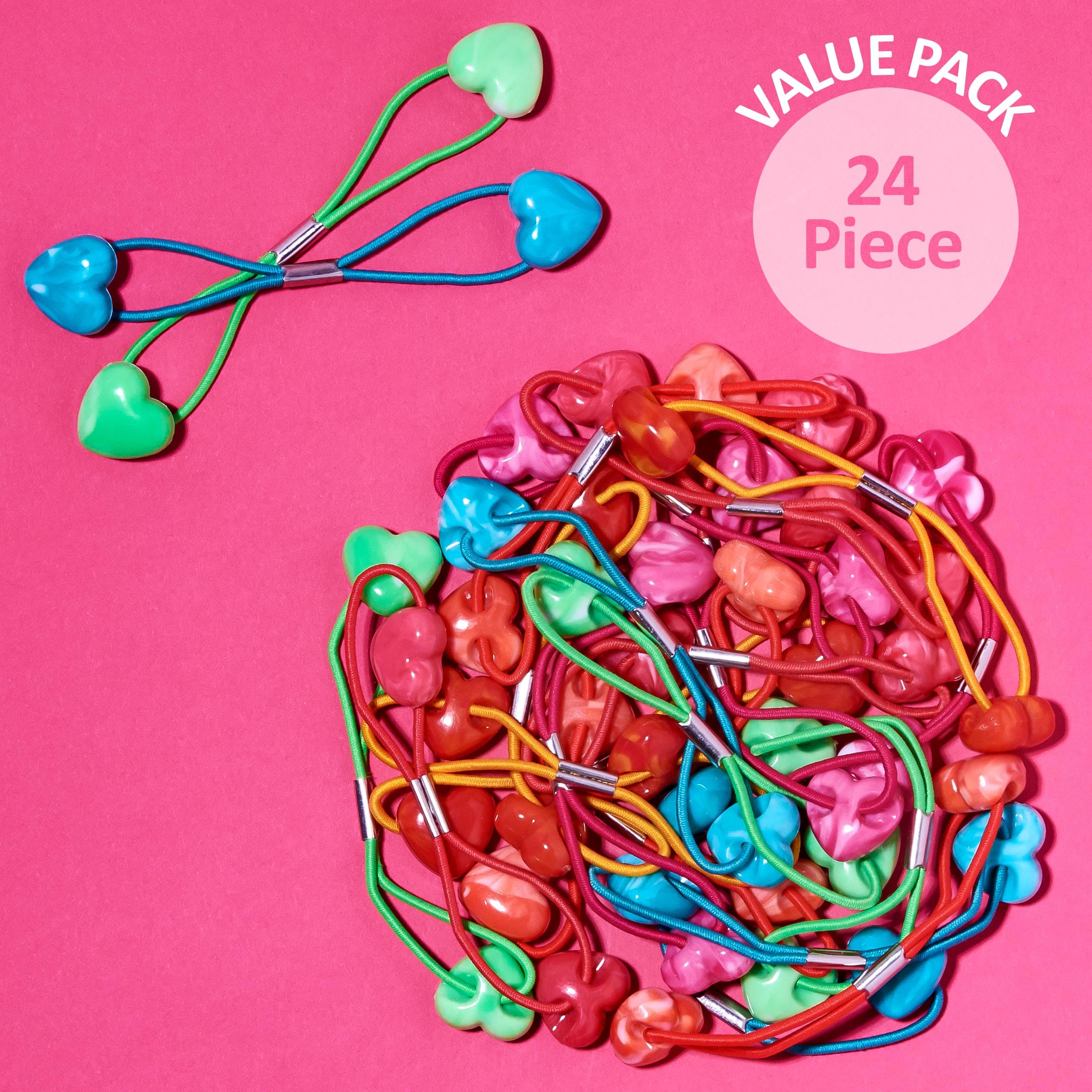 24-Piece Value Pack - This set includes 24 ponytail hair ties for girls These durable twin-bead pony tails hair ties feature an adorable heart shape and come in assorted colors including green, red, blue, pink, and orange