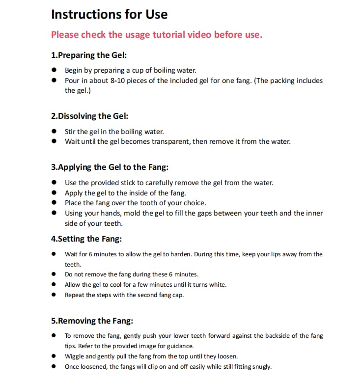 🧛 Easy to Apply with Adhesive Kit: Place the teeth adhesive beads into hot water until they turn from white to clear. Remove, press onto the fake fang to create a mold, then apply the fang to your teeth. Detailed instructions and diagrams are available on the back of the package.