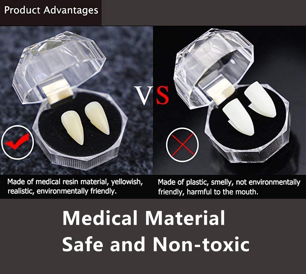 🌿 Quality Material: These vampire fangs are crafted from medical-grade resin, they are non-toxic, tasteless, and environmentally friendly, safe for teeth and look realistic.